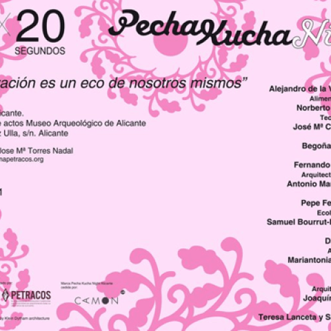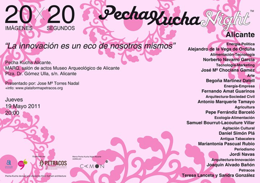 PechaKucha Night Alicante se llevará a cabo mañana con el título "La innovación es un eco de nosotros mismos." Los invitados son: Alejandro de la Vega de Orduña, Norberto Navarro Garcia, José María Choclan Gamez, Begoña Martínez Datell, Fernando Amat Guarinos, Antonio Marquerie Tamayo, Pepe Ferrándiz Barceló, Samuel Bourrut-Lacouture Villar, Daniel Simón Plá, Mariantonia Pascual Rubio, Jordi Navas, Joaquín Alvadalo Bañón, Teresa Lanceta y Sandra González.