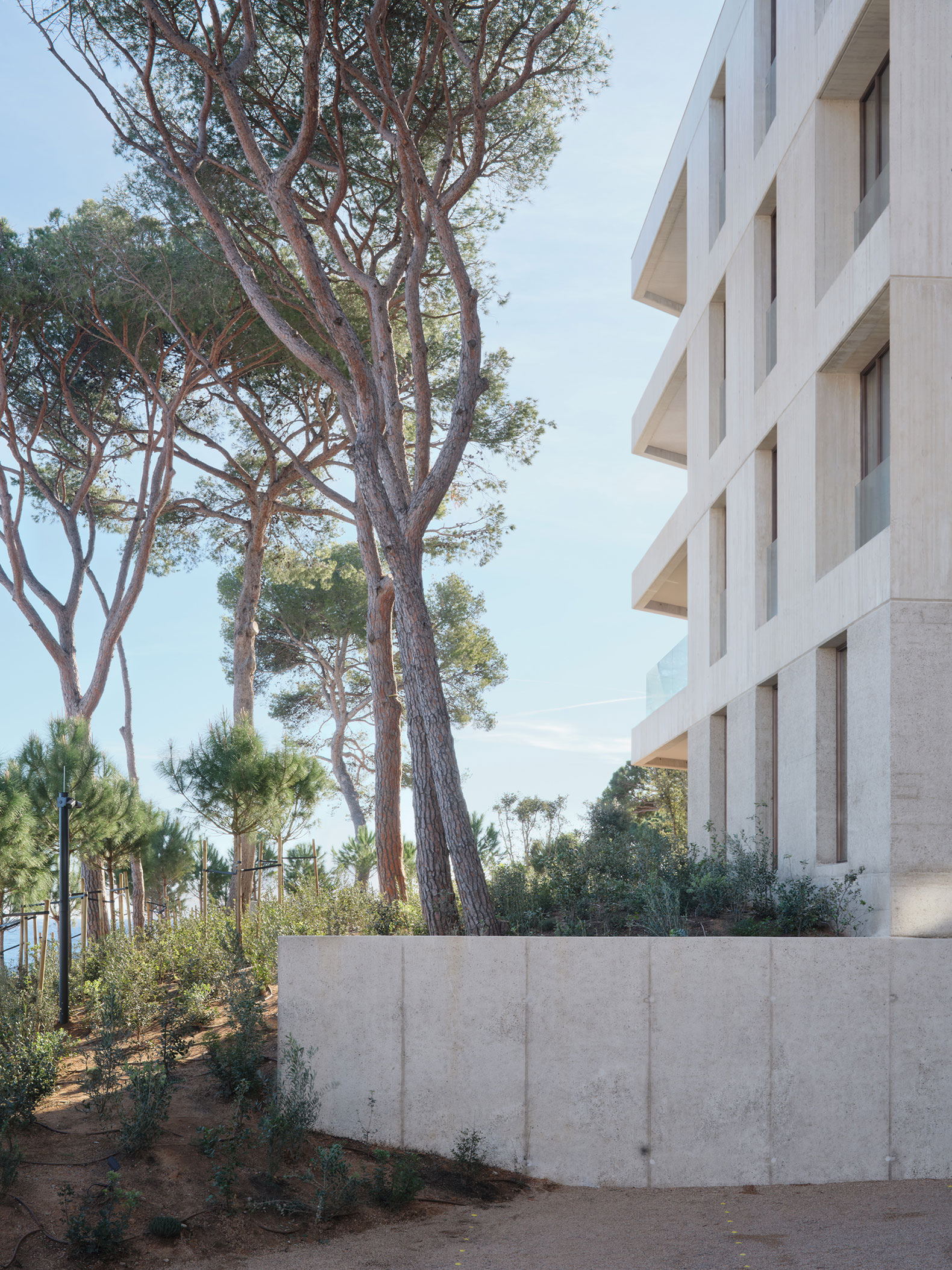 El paisajismo evidente y continuista con la vegetación vernácula es una excepción en un territorio profundamente alterado. Se recupera la vegetación de maquis y garriga con pinos (pinus pinea) y encinas (Quercus ilex). La comunicación interna se resuelve con rampas y escaleras minimizando la creación de muros de contención y modelando el paisaje de manera a salvar los desniveles. El hormigón bruto en diferentes acabados -entablillado, abujardado o liso– es el único material buscando que con el paso del tiempo se funda con el terreno.