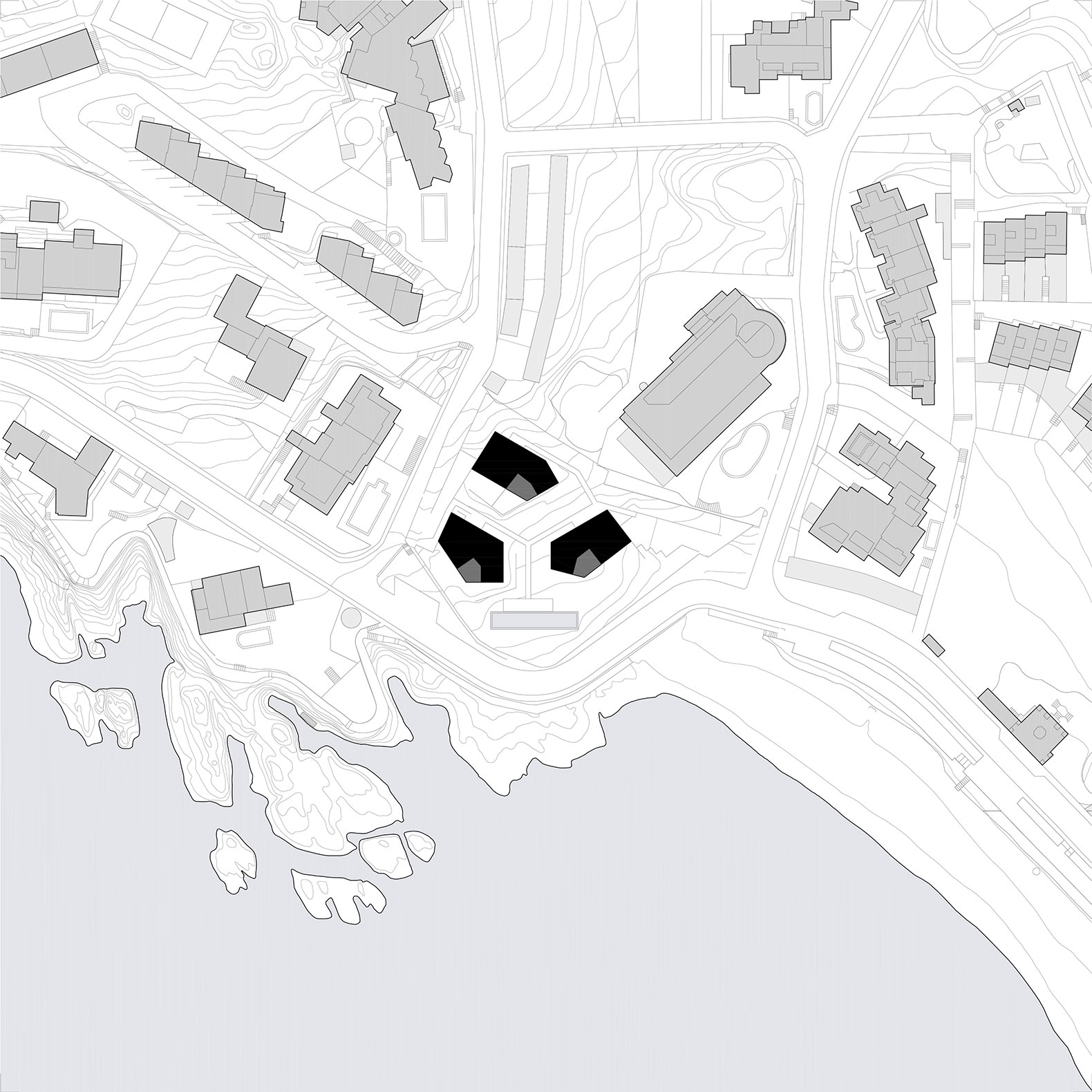 La huella de los edificios forma 3 polígonos irregulares de 5 lados que contrasta con la precisión geométrica del espacio vacío. Estos volúmenes son compactos recordando formaciones rocosas erosionadas por el mar.