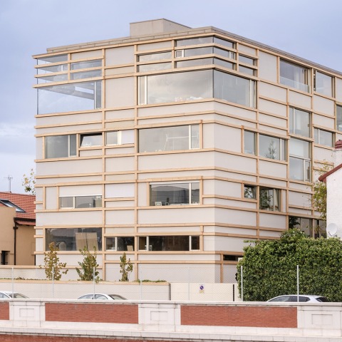Los arquitectos proyectaron una «estructura densa», que singulariza la envolvente, un elemento tridimensional de planos horizontales que además de responder a su función portante permite la protección solar, el control de la radicación solar y las vistas, asi como la insercción de diferentes espacios de almacenamiento gracias a su retranqueo (armarios, escritorios, camas, bibliotecas, encimeras de cocina..). El conjunto estructural se completa con otros tres elementos: los núcleos de madera contralaminada del ascensor, las losas de madera contralaminada, y la estructura bajo rasante de hormigón armado.