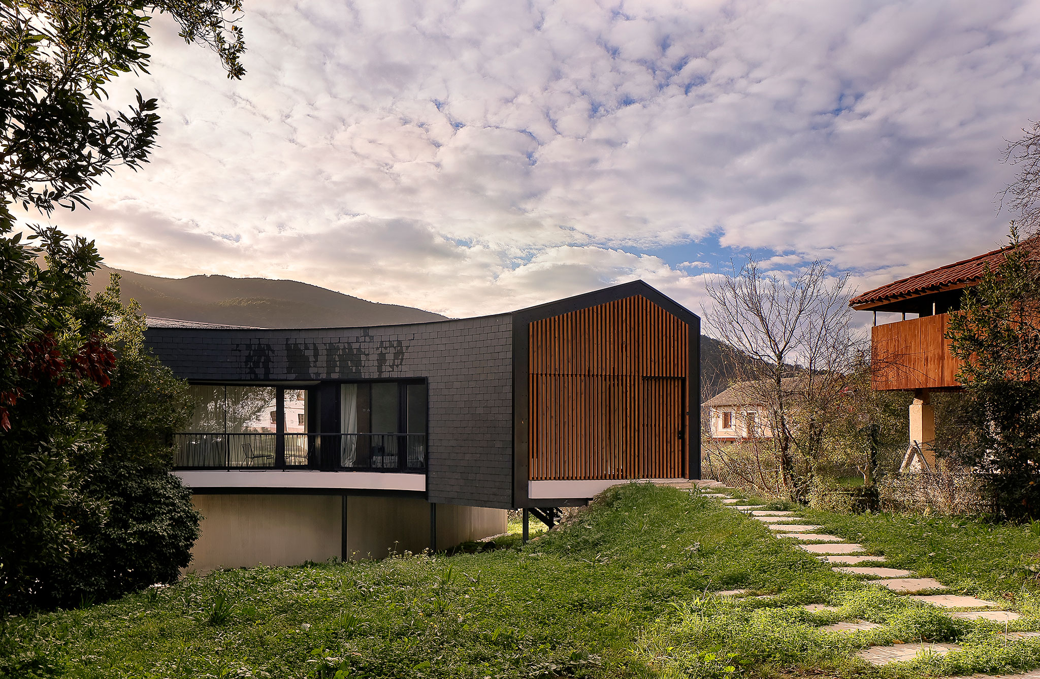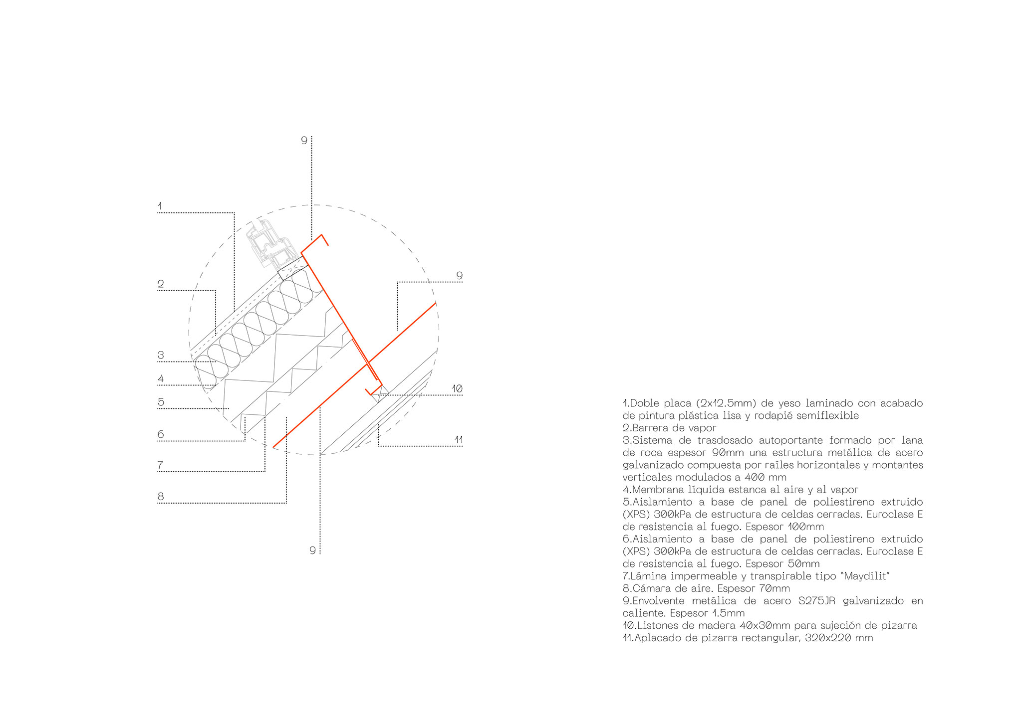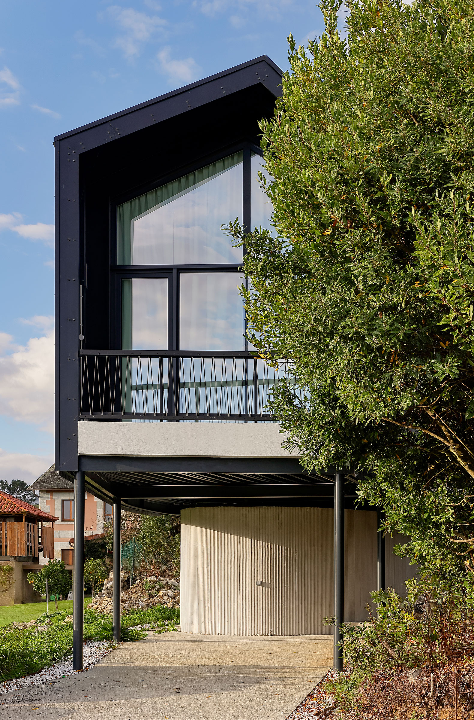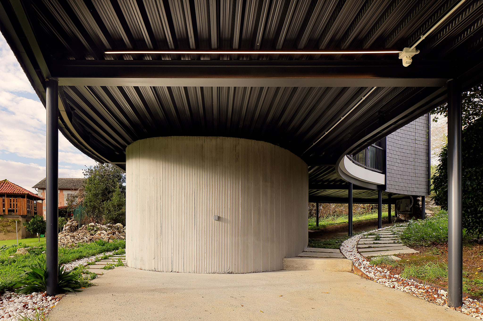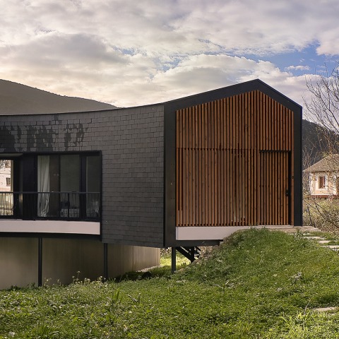 Para la construcción de la vivienda, se desarrolló un sistema que permitió generar una envolvente portante de acero S275JR de 1,5 milímetros de espesor, que funciona como un exoesqueleto rígido y tecnológico compuesto por 150 piezas únicas. Como revestimiento de la estructura, se optó por utilizar la pizarra, un material que, además de evocar la arquitectura vernácula del occidente asturiano, crea una fachada ventilada de alto rendimiento.