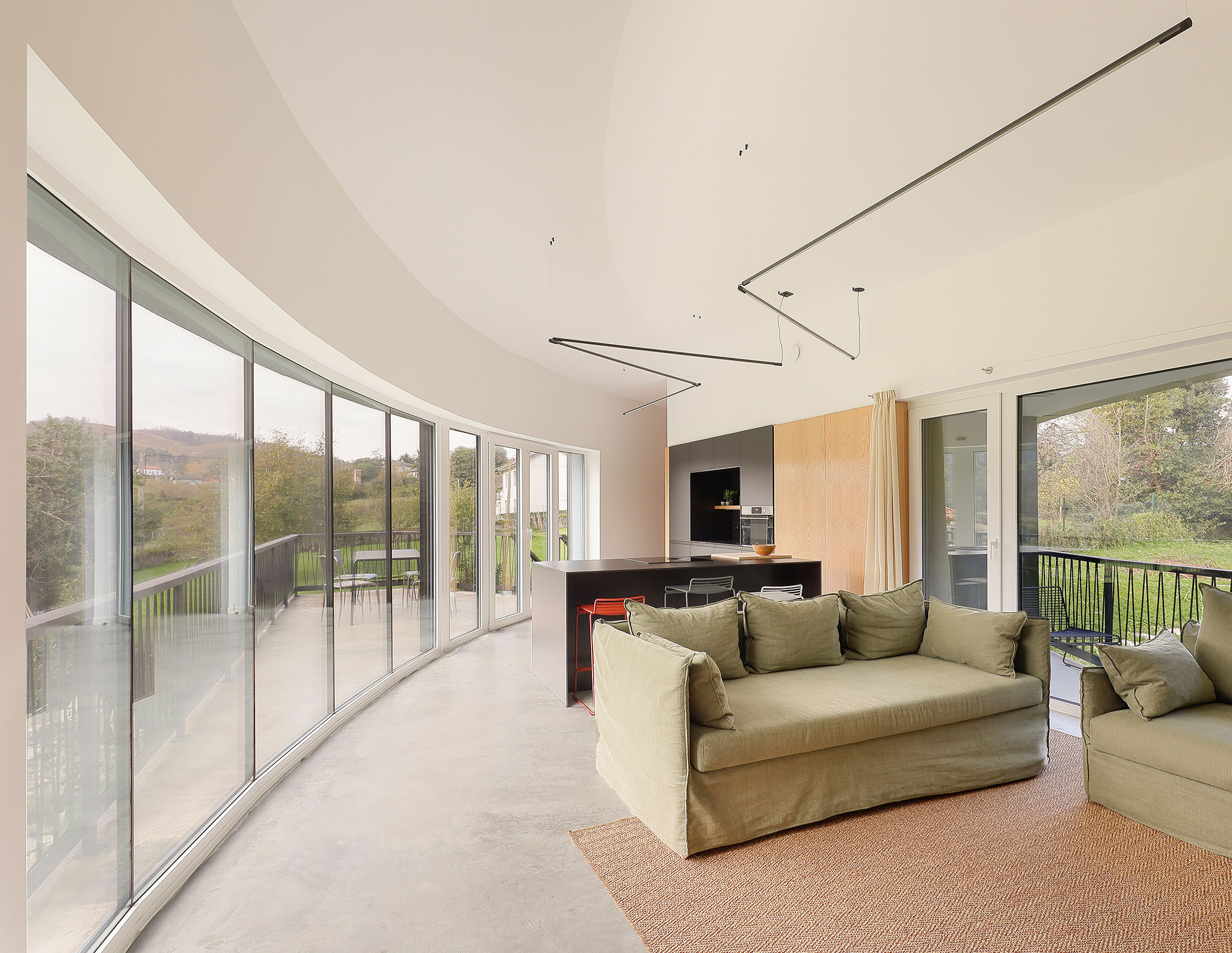 El acceso a la vivienda «Big Fish», de F5 Proyectos y Arquitectura, se realiza a través de un vestíbulo que funciona como umbral hacia el interior del hogar, mostrando una doble transparencia norte-sur que amplía visualmente el espacio de la sala y la cocina. Por otro lado, el dormitorio principal, gracias a su posición elevada y su orientación hacia el horizonte abierto del mar Cantábrico, dispone de unas vistas excepcionales.