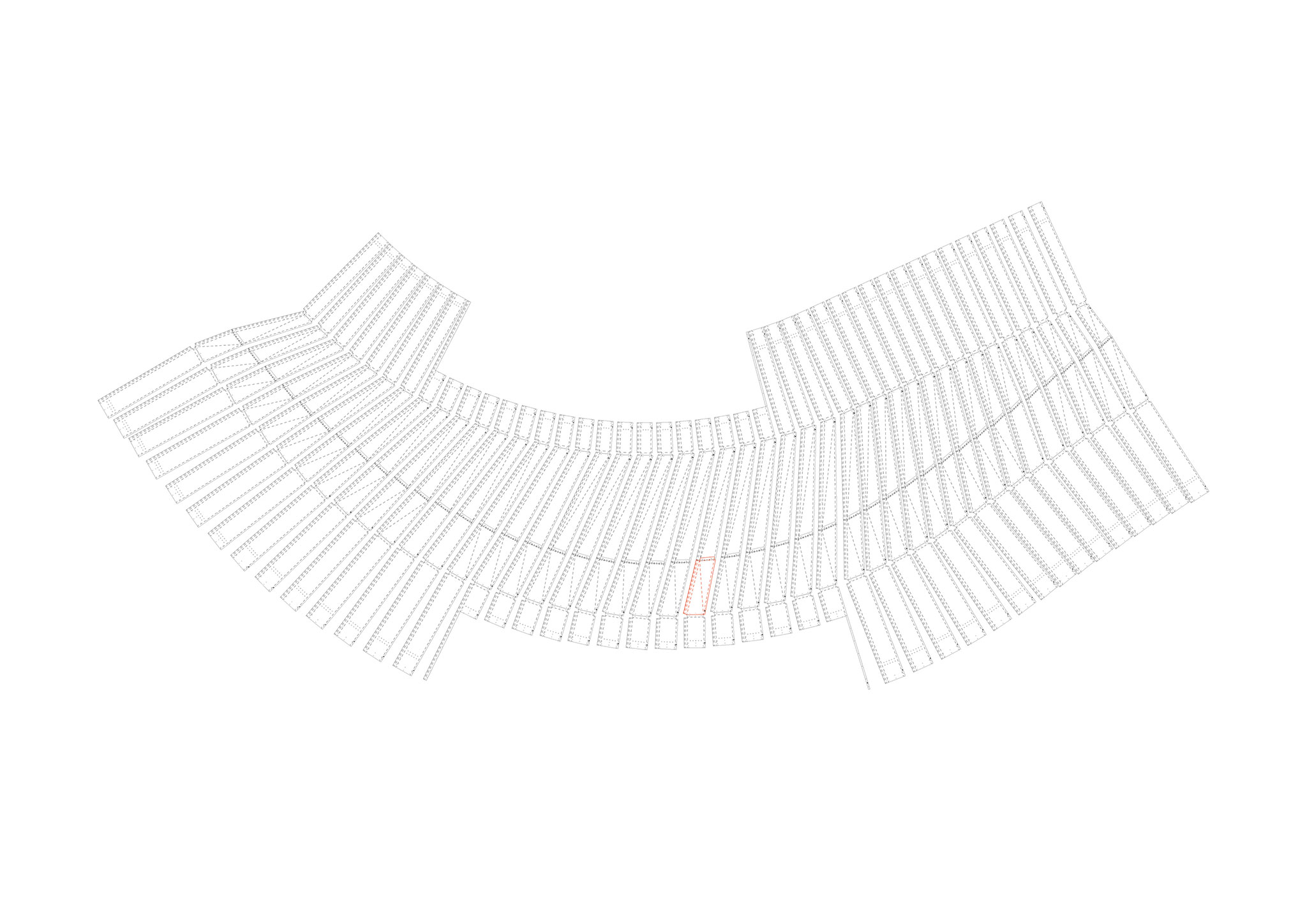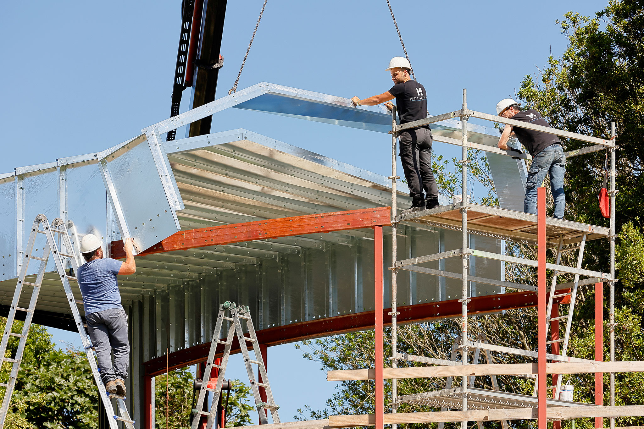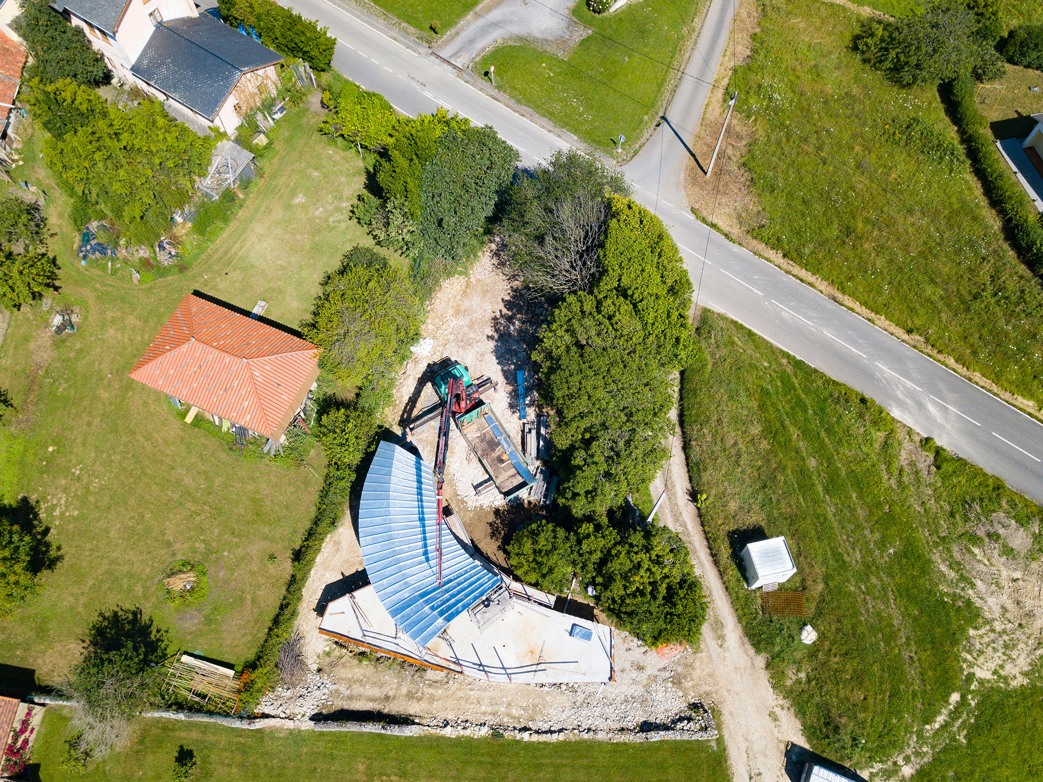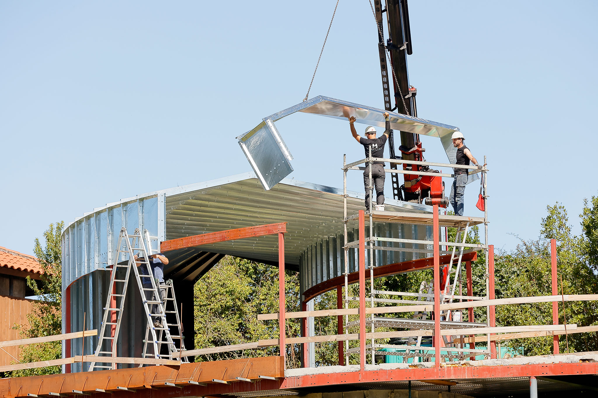 Inspirados en la capacidad del origami para dotar de una increíble resistencia y capacidad de carga a una simple hoja de papel, hemos creado y desarrollado un sistema que permite generar una envolvente portante de apenas 1.5 milímetros de espesor. Este sistema consiste en un exoesqueleto de acero S275JR, donde cada pliegue está diseñado con precisión para conferir una rigidez extraordinaria al conjunto. Es el corazón invisible del proyecto y se descompone en unas 150 piezas únicas. Cada pliegue, cada ángulo y cada perforación fueron optimizados mediante cálculo por elementos finitos y modelados en un entorno BIM. La fabricación, mediante corte por láser y plegado, garantizó un nivel de exactitud que permitió un montaje en seco, atornillado, ágil y sin margen de error. Este proceso nos otorgó una libertad formal total, permitiéndonos ejecutar las superficies de doble curvatura que dan vida a esta casa.