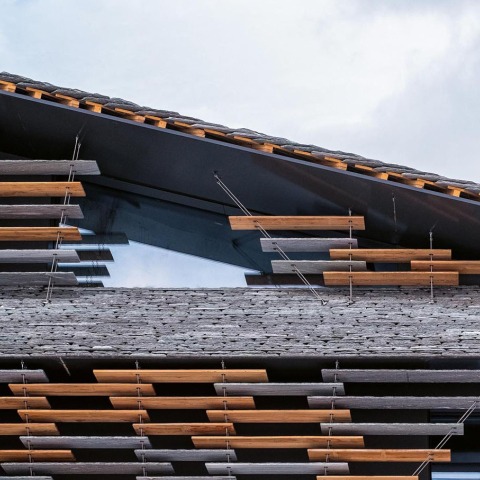 El proyecto ha supuesto un laboratorio de investigación de materiales constante. Como envolvente se desarrolló un muro cortina especial realizado por «piedras flotantes»: una estructura a modo de persiana de piedras y tablas de madera que es soportada por cables de acero inoxidable de 8 mm, que es permeable a la luz y las vistas. Una piel compuesta por 882 piezas de piedra (las finas losas de piedra de 25 mm se dividieron primero horizontalmente, luego se reforzaron con tela en el medio y luego se volvieron a pegar) y 501 de madera, donde las losas de piedra pesan un total 24 toneladas y cada cable tuvo que pretensarse con 500 kilogramos.