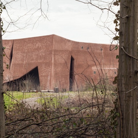 El edificio contruido por Oppenheim Architecture convive con un bosque protegido y a su vez con los parques industriales, de modo que el edifio es mediador entre estos entoros tan dispares. Para ello, se combinó el caracter tecnológico del mismo, con una forma orgánica, con un hormigón proyectado con arcilla del entorno en la fachada, y genera una superficie rojiza y aspera, que simula a la propia roca del lugar, y a su vez permite el crecimiento de musgo en la fachada. Su objetivo en este poyecto era construir con la naturaleza, no sobre ella, tal como cuentan los propios arquitectos.