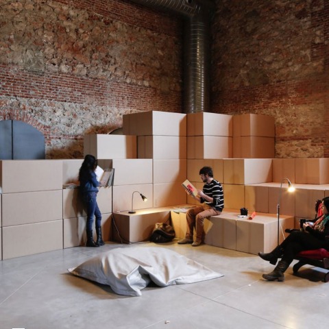 Husos desarrolla un proyecto de diseño de espacios residenciales y exposiciones para artistas en la nave 16.1 en Matadero Madrid con su sistema "Do It Together": sistema de mampostería de autoconstrucción reversible de cartón y Velcro. Desarrollado dentro del proyecto Here together Now, Centro Cultural Matadero. Madrid. 2013.
