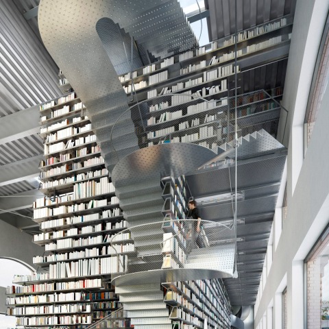 y agrega "Al destruir la integridad estructural del edificio original (es decir, mediante la eliminación de la tercera planta), se deben tomar una serie de importantes medidas para hacer que el esquema sea viable: grandes vigas de transferencia que van desde la pared exterior a pared exterior se deben añadir a nivel del antiguo forjado (éstas apoyan los niveles colgantes de estanterias), mientras que las columnas exteriores deben reforzarse de manera que sean capaces de resistir el pandeo incluso con su longitud efectiva duplicada necesitan refuerzos en diagonal que se añadirán a los nuevos porticos estructurales, ya que los forjados que han proporcionado la estabilidad necesaria serán eliminados. Además, las bases del perímetro del edificio deben ser reforzadas para resistir las cargas adicionales que bajan de las vigas de transferencia. Recuerdese que la mayoría de las cimentaciones se echan en el lugar antes de que la superestructura se construya; es evidente que es mucho más difícil de apuntalar un edificio existente De hecho, lo que era un edificio industrial de 3 pisos perfectamente viable, admirablemente capaz de soportar casi cualquier cosa que se quisiera colocar en el interior, se convertirá en un artefacto a medida que pasará a ser (cuando la biblioteca quede obsoleta en un futuro próximo) inutilizable para cualquier otra cosa, a menos que todo el edificio se vuelva a configurar de nuevo a un gran coste. (Bueno, supongo que con los pilares interiores retirados, el espacio de doble altura se podría convertir en una cancha de baloncesto.)