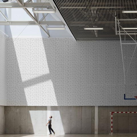 La ubicación del grueso del programa en el cuerpo inferior permite agrupar todos los servicios y los elementos técnicos articulados en torno al rocódromo y la pista polideportiva. Tan solo las piscinas y el spa, quedan dentro del prisma superior. Separando funcionalmente su uso, al mismo tiempo que disfrutando de inmejorables vista hacia Aretxabaleta y el valle del alto Deba. La ubicación como atalaya es la referencia del proyecto e idea generatriz del mismo. Una gran ventana que se abre al paisaje y relaciona la actividad deportiva con su entorno.