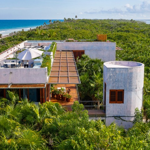 Elevando la casa sobre unas columnas en forma de cruz, impactamos el entorno lo menos posible y generamos vistas por arriba de la duna que separa el terreno del mar. Así, el proyecto se organiza en tres niveles que se conectan por medio de una escalera en espiral: la planta baja auxiliar abajo de la casa, el nivel intermedio con todos los espacios interiores y una gran azotea con una alberca y un comedor al aire libre ofreciendo vistas al mar caribe, la selva y la laguna. Cercano al cuarto principal, se encuentra una torrecita singular: un elemento formal que ancla el conjunto en su lugar y funge como espacio flexible para trabajo o meditación.
