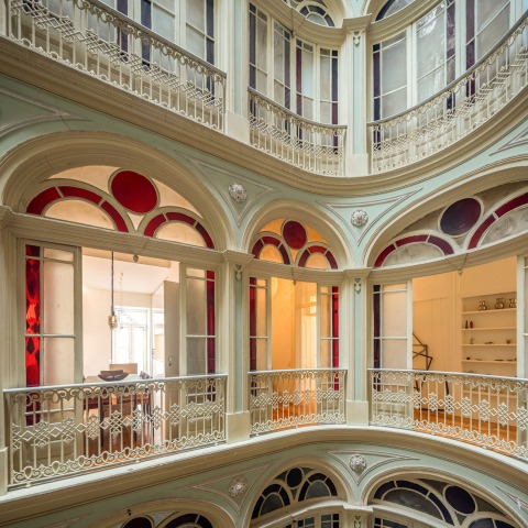 Para recuperar y así restaurar el aura antigua del apartamento, fue necesario intervenir en algunas áreas que fueron cubiertas después de la rehabilitación del edificio, como la despensa y las magníficas vidrieras que se abren hacia un gran patio interior central que ilumina y eleva su magnificencia.