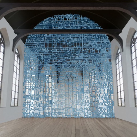 Pretty Vacant realizada por la oficina holandesa de diseño e investigación Rietveld Landscape ha construido una pantalla con arco de espuma montada con cientos de piezas perforadas en forma de edificio dentro de una capilla abandonada en el Centraal Museum de Utrecht. La instalación anima a los visitantes a realizar una nueva mirada de los espacios "vacíos" del museo.