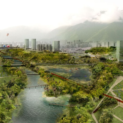 1. Equilibrio ambiental: Recuperación del paisaje natural del valle de Caracas, fortalecimiento de la conectividad ecológica entre el Ávila, el río Guaire y las colinas al sur. Aporte para el saneamiento del rio y control de inundaciones. Re-naturalización del río Guaire y las quebradas con la topografía, y consolidación de un sistema metropolitano de parques y corredores verdes.