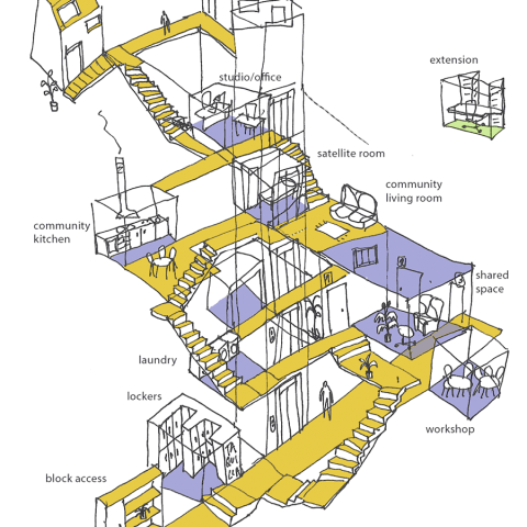 Las intervenciones propuestas se plantean con criterios temporales y reversibles, reutilizando aquellas viviendas vacías o no utilizadas, a través de la reconfiguración espacial interior, utilizando algunos espacios como espacio común y para uso de oficinas. En el exterior, las adiciones temporales construidas en madera reconfiguran la circulación y añaden funciones comunitarias como invernaderos en la azotea.