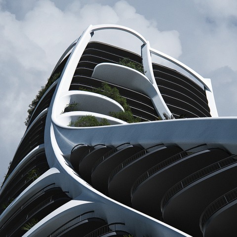 La fachada exterior de Qondesa crece desplegando vegetación desde las jardineras de sus balcones, con una estructura que emula enredaderas  que se entrelazan alrededor del edificio para ir estrechándose en su parte superior. La forma exterior del edificio está plegado hacia atrás para no no impedir la llegada de luz natural y vistas de los edificios próximos.