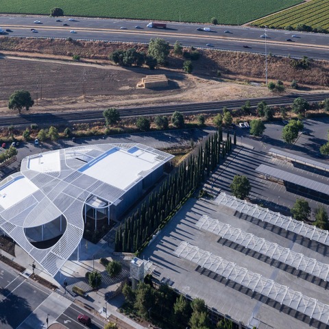 La vista de las tierras agricolas y sus ordenadas tramas de cultivos que rodean el museo inspiraron la geometría de la gran cubierta y el revestimiento exterior de hormigón prefabricado. Un uso de materiales con textura de aluminio, hormigón, vidrio claro, madera y paredes blancas-responde sutilmente a la luz suave del Valle Central. La orientación y la separación de las vigas de aluminio que cubren la zona a forma de toldo, más de 900 en total, crean un rico tapiz de luces y sombras.