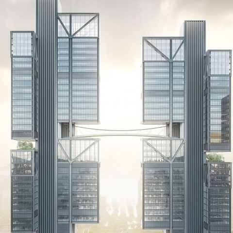 "Las torres gemelas combinan espacios sensibles de investigación y desarrollo con oficinas y otras funciones públicas. Los pisos están dispuestos en volúmenes flotantes en voladizo desde núcleos centrales de grandes megatrusiones de acero, creando grandes espacios libres de pilares, con unos laboratorios en una exclusiva plataforma de cuatro alturas para probar el vuelo de drones. Las torres están conectadas por un puente aéreo, que se convertirá en otra plataforma para exhibir la última tecnología de drones". explica la descripción del proyecto.