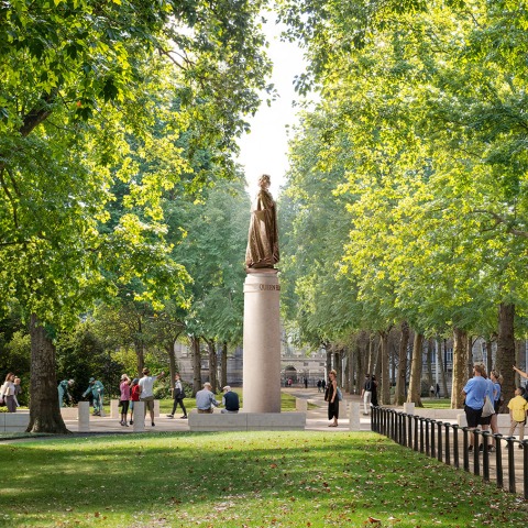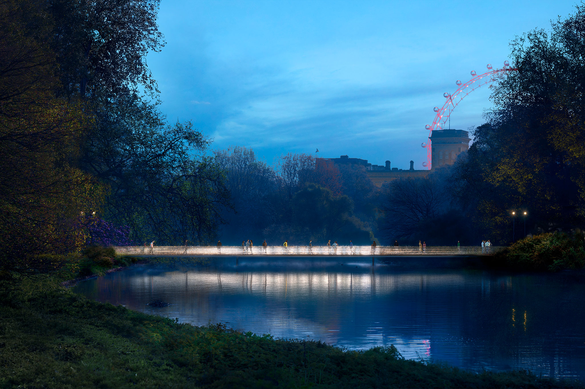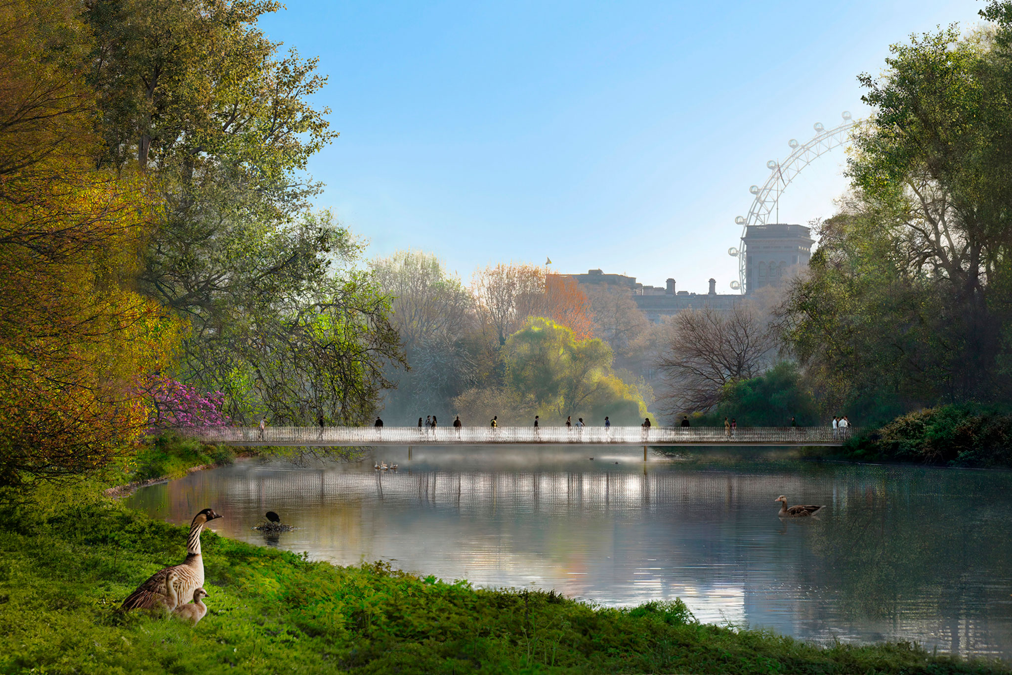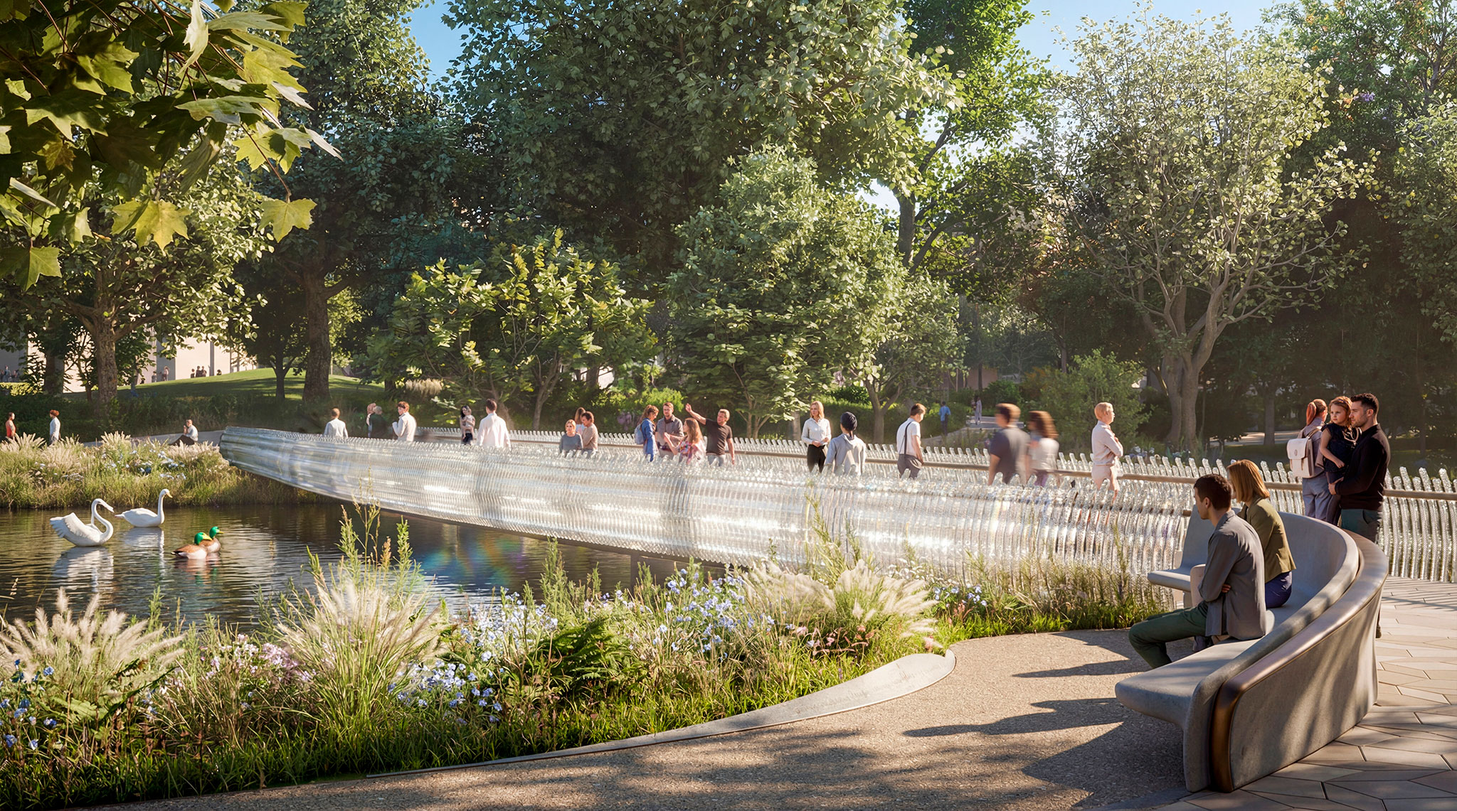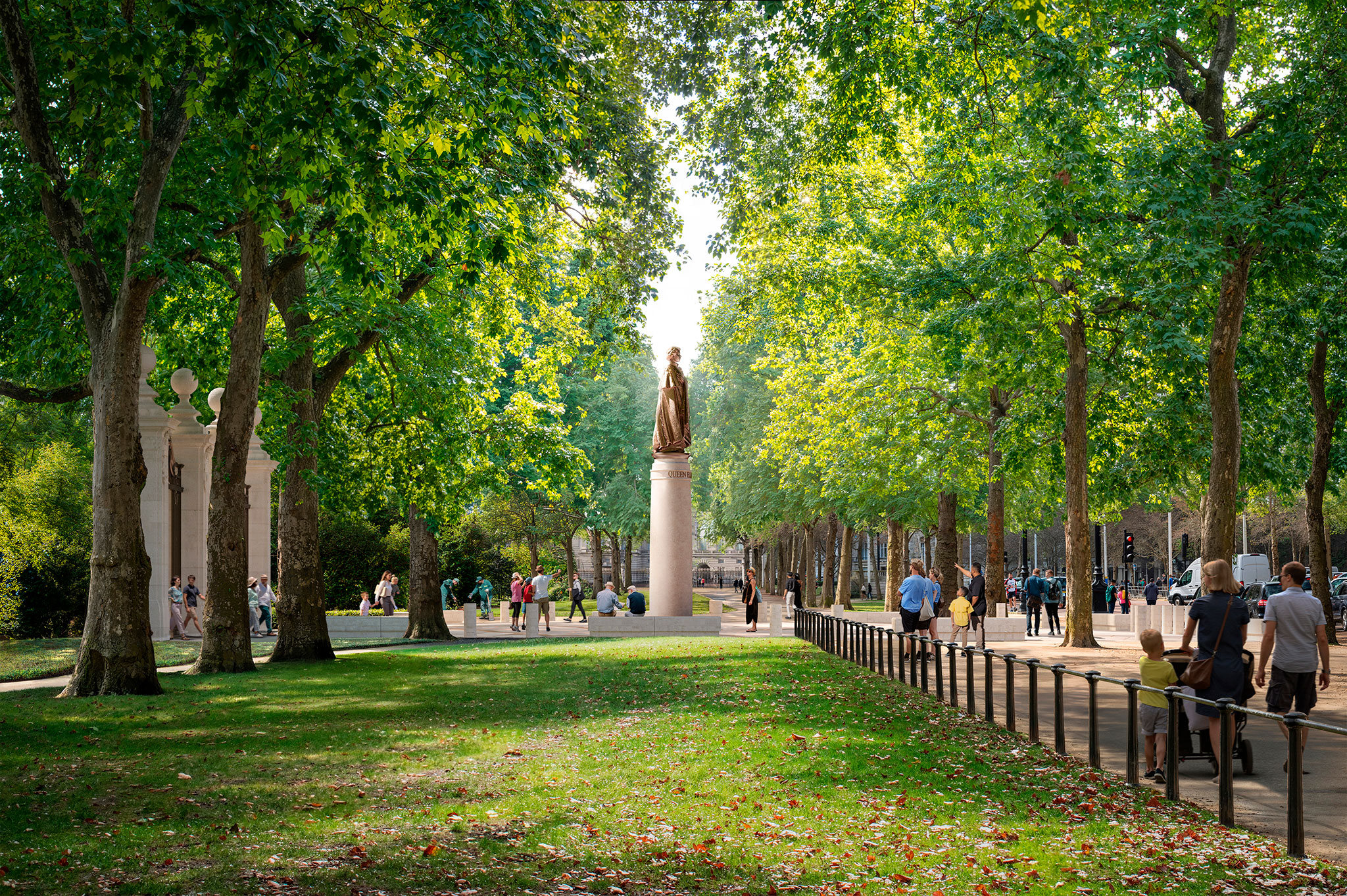 El monumento permanente también contará con: un nuevo puente de vidrio fundido inspirado en la tiara Fringe de la Reina María, que la Reina Isabel II lució el día de su boda; un busto de la Reina en sus últimos años, obra de la escultora Karen Newman; y la escultura eólica de la Commonwealth, una nueva obra abstracta de Yinka Shonibare. El proyecto también incluye jardines dedicados a la Commonwealth y a las naciones del Reino Unido, creando espacios para la relajación y la reflexión. El monumento se ha desarrollado en colaboración con el Comité del Monumento a la Reina Isabel, tras un concurso celebrado el año pasado.