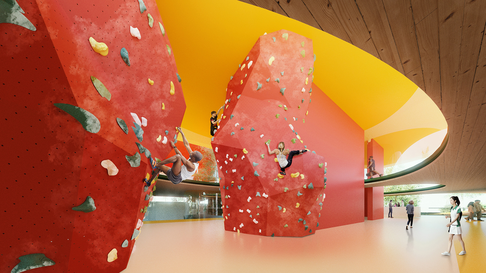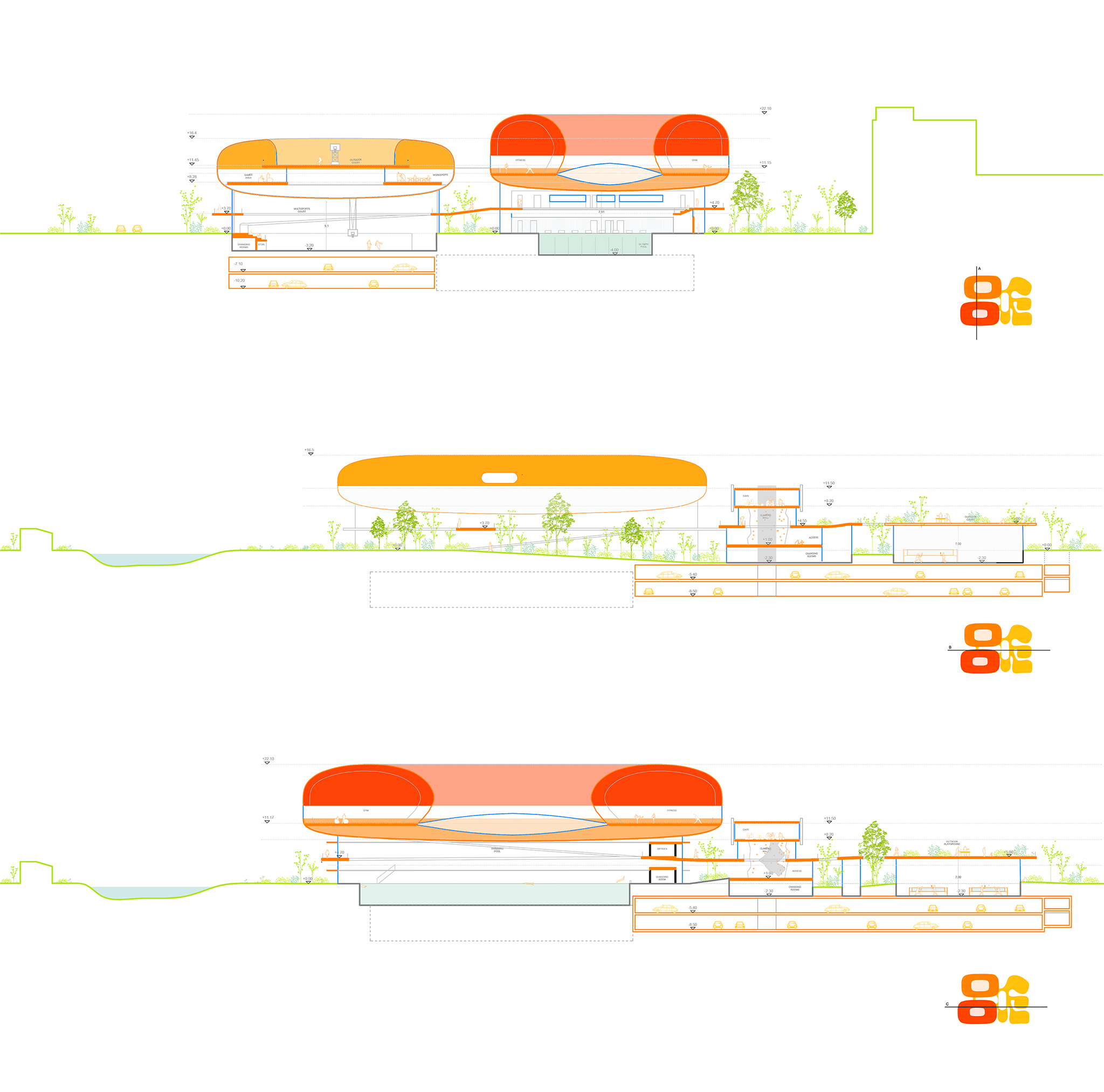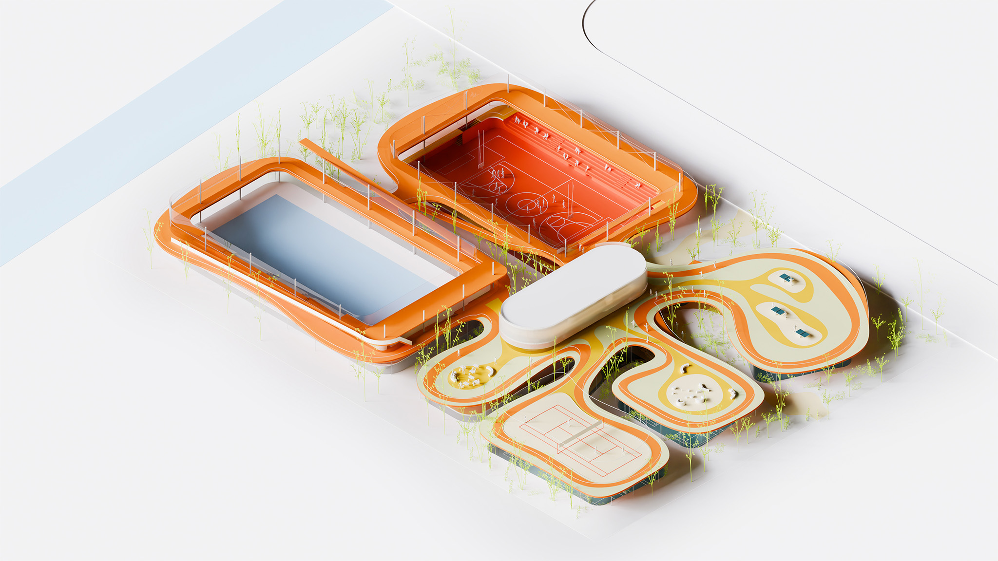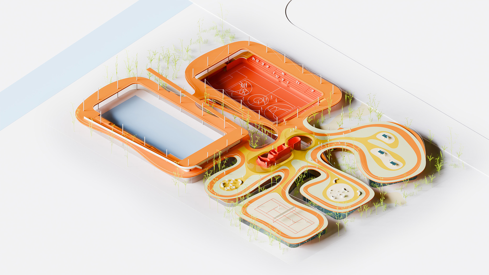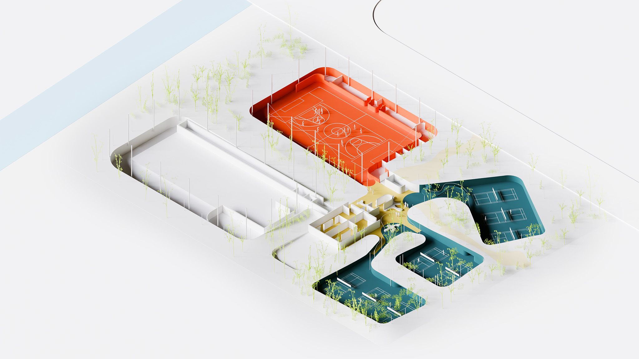 Funcionalmente, el centro está organizado en zonas diferenciadas para natación, pistas polideportivas y bádminton, con sólidas conexiones entre el interior y el exterior. Las tecnologías inteligentes y las estrategias pasivas optimizan el control climático y la sostenibilidad. Los materiales se eligen por su rendimiento ambiental, incluyendo ETFE, tartán reciclado, madera y acabados con bajo contenido en COV.