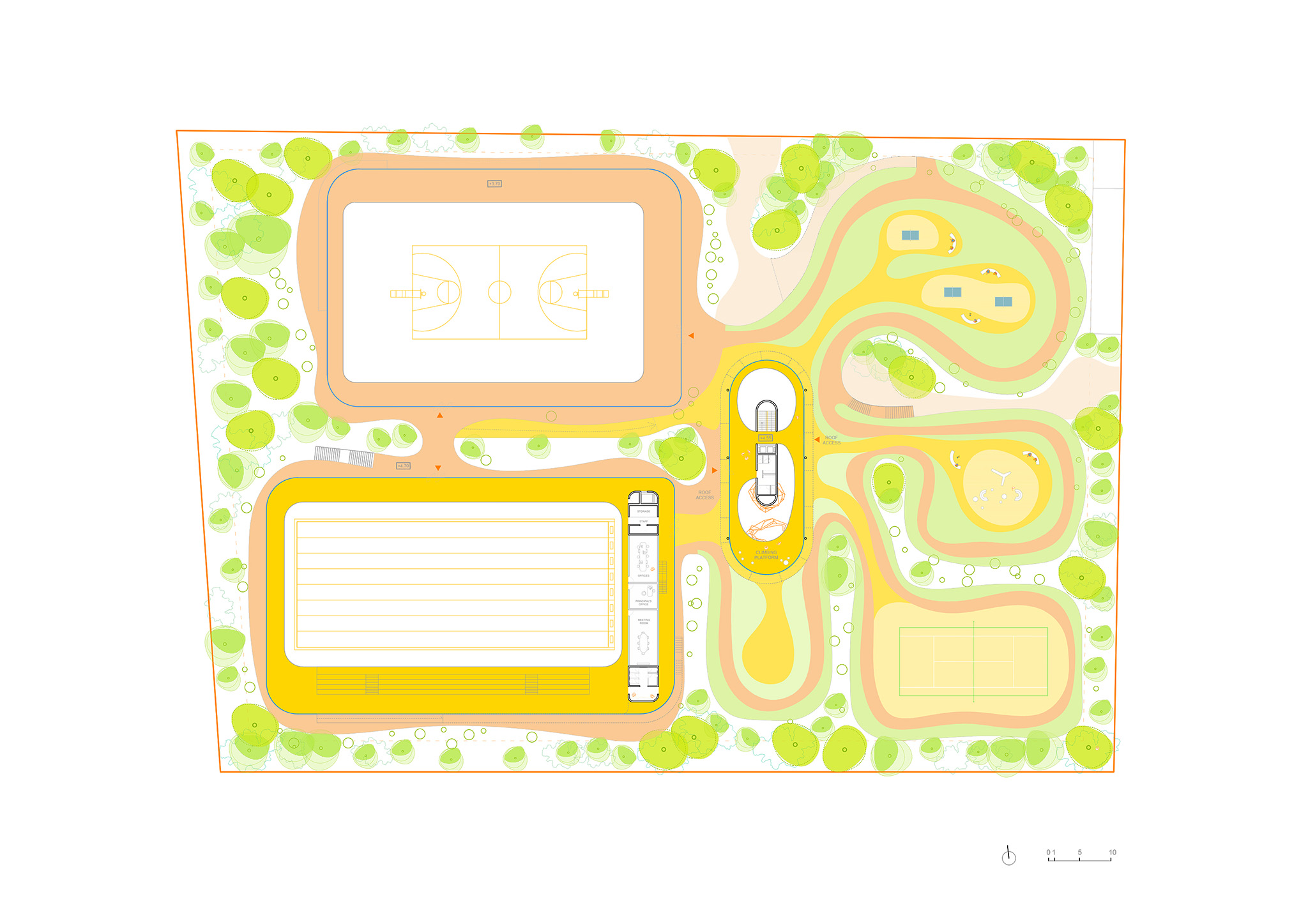 Puentes, patios y pasarelas, conectan el proyecto con el patrimonio local. Una arquitectura de que no se impone como una estructura masiva, sino que se presenta como un punto de referencia que recupera el espacio para el cuerpo humano. En lugar de competir con el ruido (visual, espacial y simbólico), la propuesta para el centro deportivo emerge orgánicamente como un volumen escultórico, que le al otorga proyecto memoria e identidad.