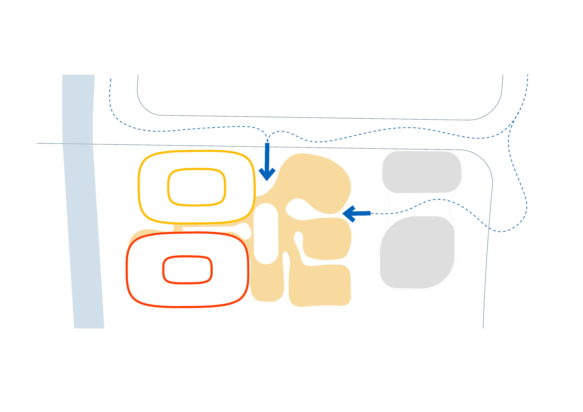 En nuestra propuesta, las formas orgánicas dominantes cumplen precisamente este propósito: actuar como una presencia magnética en el entorno. Su geometría única y su vibrante materialidad las hacen reconocibles al instante, despertando la curiosidad y resultando atractivas. Como puntos de referencia, ofrecen identidad no solo al edificio, sino al vecindario en general, dotándolo de significado, carácter y un sentido de pertenencia.