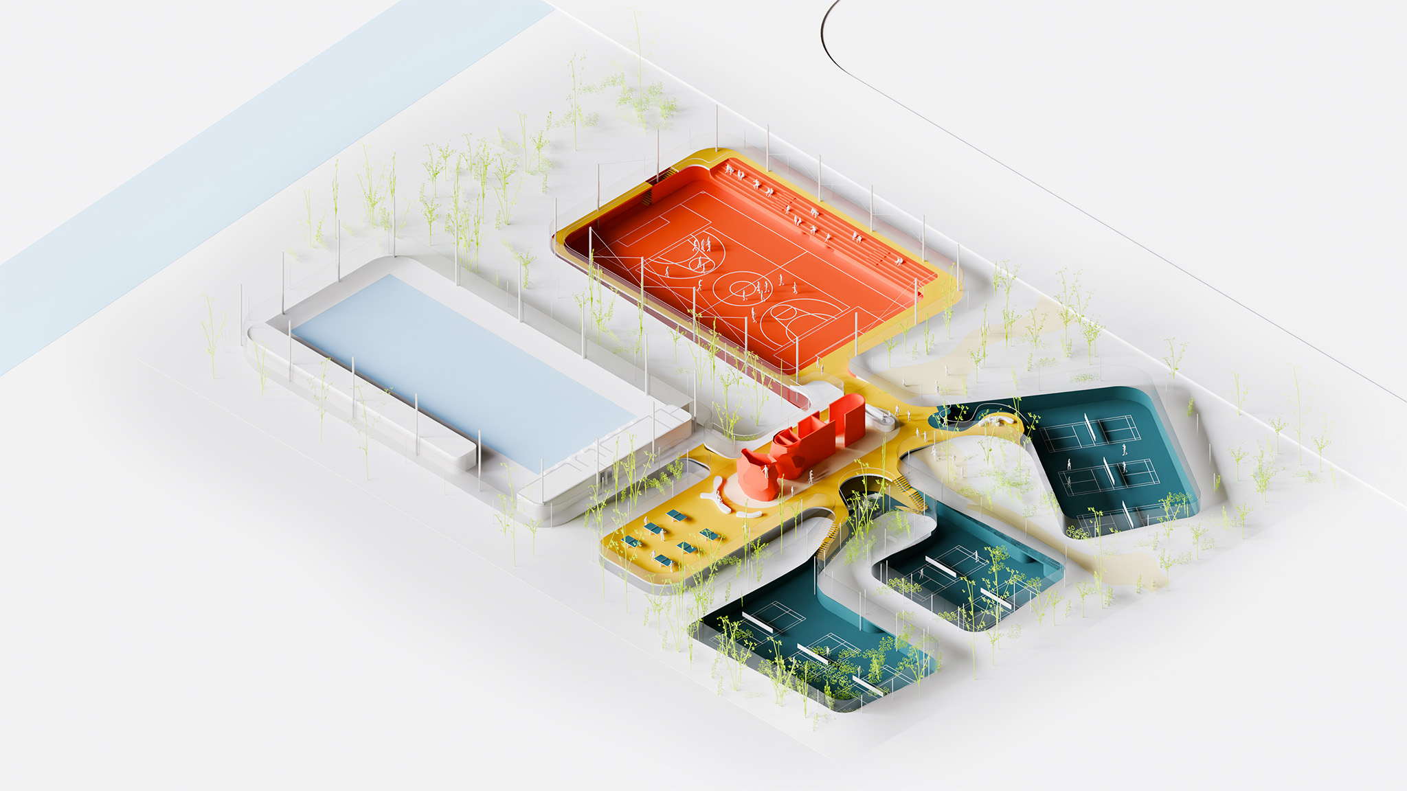 El centro deportivo propuesto en Sijing Town, a las afueras de Shanghái, se concibe como un punto de referencia sostenible y a escala humana, profundamente integrado con su contexto natural y cultural. Ubicado cerca de las principales vías de transporte y corredores verdes, el sitio ofrece excelente accesibilidad y oportunidades para promover la movilidad activa. El proyecto enfatiza la conexión con la naturaleza, incorporando senderos para correr, ciclovías y conexiones con parques cercanos para crear una red centrada en el bienestar.