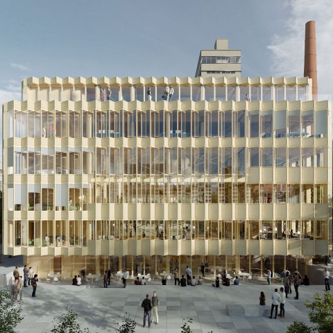 Un canopee de acceso entendido como lugar de encuentro que ofrece una transición amable entre el espacio público y el interior y una atención al pasado industrial del enclave mediante el respeto y la integración del silo de la antigua fábrica de cerveza que se mantiene exento e intocado a modo de campanile convertido en elemento de señalamiento del campus visible desde las escarpadas topografías de la ciudad funcionan como activos urbanos de una institución abierta, pluridisciplinar, inclusiva y transversal. El edificio propiamente dicho se concibe desde la sensibilidad medioambiental más ambiciosa, especialmente en lo que se refiere a su huella de carbono. La estructura de madera en pilares, vigas y forjados, montada en seco con elementos repetitivos e intercambiables en el futuro es protagonista en este planteamiento. Las instalaciones y las subdivisiones interiores se integran en el esquema estructural mediante la estrategia de desdoblar las vigas generando un espacio para alojar los trazados principales de las redes y encajar las tabiquerías materializando una concepción holística del conjunto modulado a 760cmx760cm y sus submúltiplos.