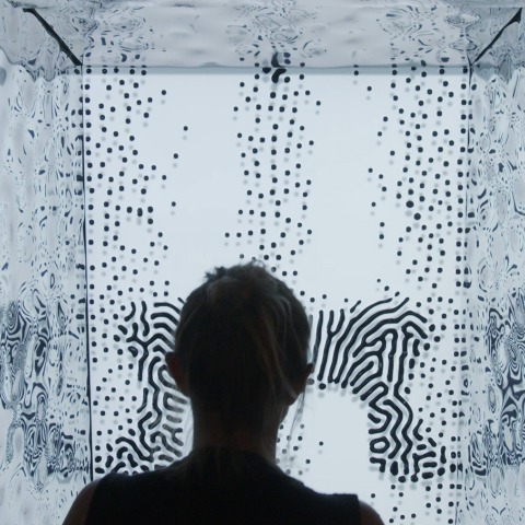 Un dispositivo de interfaz cerebro-ordenador mide la actividad neuronal de los visitantes y adapta en consecuencia la resolución del ferromaterial, facilitando una interacción más intensa entre el ser humano y el material. La experiencia visual se refuerza a través de los reflejos y refracciones de la imagen en el interior de una cámara inmersiva a escala de sala, que funde por completo al visitante con la luz y sus reflejos visuales.