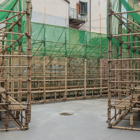 El sitio en sí mismo evoca la antigua producción de codos y cuerdas para barcos, elaboradas en el Arsenale veneciano, el complejo industrial premoderno más grande del mundo. Para subrayar esta conexión, la exposición invita a los «shifu», o maestros del bambú de Hong Kong, a construir un andamio de bambú en el patio exterior.