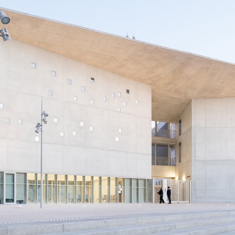 El desafío del proyecto se basa en una cuidadosa consideración de las limitaciones del sitio. Las elecciones arquitectónicas sirven al objetivo de ergonomía y economía general del edificio. Las fachadas exteriores destacan por sus muros de base de hormigón blanco dispuestos según una amplia distribución. Algunos paneles están calados con un patrón progresivo, inspirado en las claustras mediterráneas. Estas fachadas siguen la forma de V del edificio que adopta la apariencia de un libro abierto. Se encuentran en un vestíbulo acristalado que ofrece una entrada luminosa y generosa.