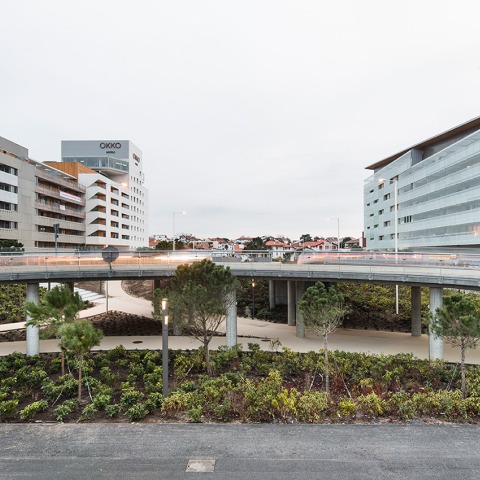 Esta línea continua forma el límite entre el parque – acceso al puente y también dialoga en su parte posterior con el conjunto urbano, de menor escala, existente. En planta baja permeable, la continuidad peatonal urbana a través del nuevo espacio urbano está garantizada.