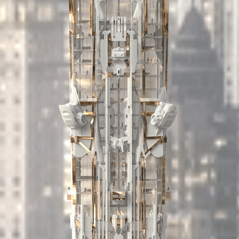 Un edificio residencial de 102 plantas con amplias vistas a Central Park y al horizonte de la ciudad de Nueva York diseñado por Mark Foster Gage Architects. Cada vivienda tiene su propia y única fachada y balcones tallados con figuras que enmarcan las características particulares de los paisajes urbanos y naturales de los alrededores. El edificio está envuelto en una fachada de paneles de hormigón Taktl © y piedra caliza-teñida (tallados usando la tecnología CNC) hidroformados con detalles de chapa de bronce y aleaciones estructurales de latón tintadas en rosa envolviendolas. Los detalles decorativos de bronce y latón se extienden por toda la torre, y se han utilizado para crear elementos con formas dentadas en la base y secciones curvadas que se hacen eco de las formas de las alas situadas más arriba en el edificio. En la parte superior de la torre, una plataforma de observación está enmarcada por detalles metálicos esculturales, incluyendo lo que parecen ser los rostros de las criaturas al igual que en cada esquina.