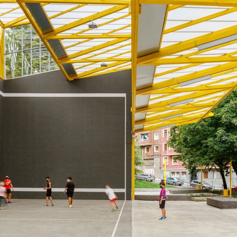 Todo está modulado según el tamaño de las placas de policarbonato celular, generando una limpieza constructiva y una coordinación dimensional en todo el edificio. La pérgola se ha formalizado prolongando la cercha más baja del frontón otros 28 metros hacia el este, paralela al muro de contención existente. Esta cercha se sustenta en el lateral del muro del frontis por un lado y en un poste triangular de hormigón armado en el otro extremo. De este modo, se ha evitado la aparición de postes que puedan molestar en esta zona diáfana de la plaza.