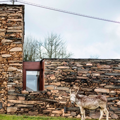 Una antigua bodega con muros de piedra en el norte de España (Ribeira Sacra, Lugo) convertida en una vivienda unifamiliar por los arquitectos de Cubus Arquitectura, Estel Ortega Vázquez y David Pou van den Bossche, con sede en Barcelona.