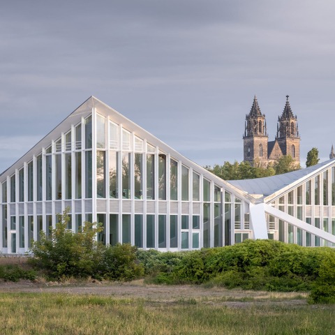 En términos de construcción y diseño, las nuevas estructuras interiores recuerdan a la fachada exterior original con su énfasis vertical y materiales industriales de acero y vidrio. La nueva fachada de vidrio transparente abre vistas hacia y desde Rotehornpark, el parque de la ciudad en el centro de Magdeburgo, y reemplaza el antiguo acristalamiento industrial translúcido, manteniendo la estructura original de la fachada.