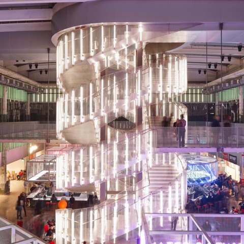Dentro de las bandas hay tres atrios, llamados X, O y Z, cada uno de los cuales contiene una escalera monumental que lleva a los visitantes al paisaje del techo y vistas de regreso al centro. Las escaleras son distintas en carácter, estructura y material, pero todas están diseñadas para fomentar la interacción. Sus caminos se duplican, entrelazan y expanden para proporcionar no solo trayectorias hasta el techo, sino también lugares para encuentros accidentales: cada uno es un instrumento para unir a las personas.