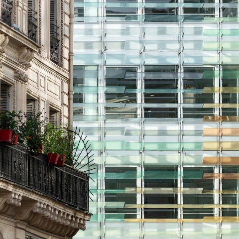 El proyecto es parte de la restauración, parte reconstrucción de un importante edificio protegido de Haussmann, con la adición de una estructura contemporánea de 20.000 m², que abarca hasta siete pisos. La sorprendente intervención contemporánea se caracteriza por una fachada de rejilla de vidrio delicadamente teñida, que se eleva por encima de los pisos inferiores de peristilo.