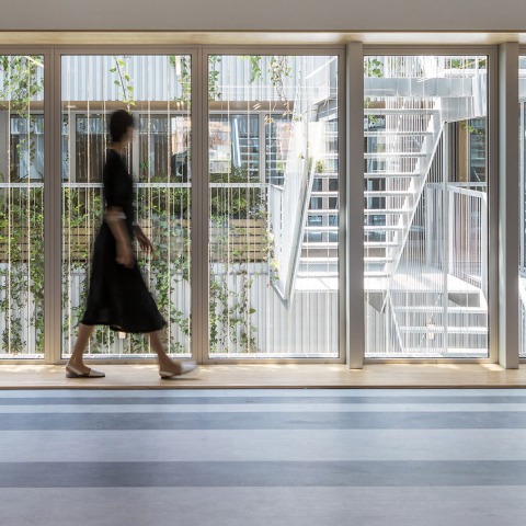 Se propone la inclusión de un patio verde y escalonado mejorando las condiciones lumínicas y de ventilación de los espacios interiores. La sección escalonada optimiza la entrada de luz en todas las plantas y genera terrazas que amplían las zonas de trabajo con nuevos espacios exteriores de reunión y encuentro. En el patio también se incorpora una nueva escalera reforzando la conexión entre las plantas y fomentando hábitos saludables. La vegetación acaba siendo protagonista de la mayoría de espacios exteriores fomentando la biodiversidad y generando espacios biofílicos.