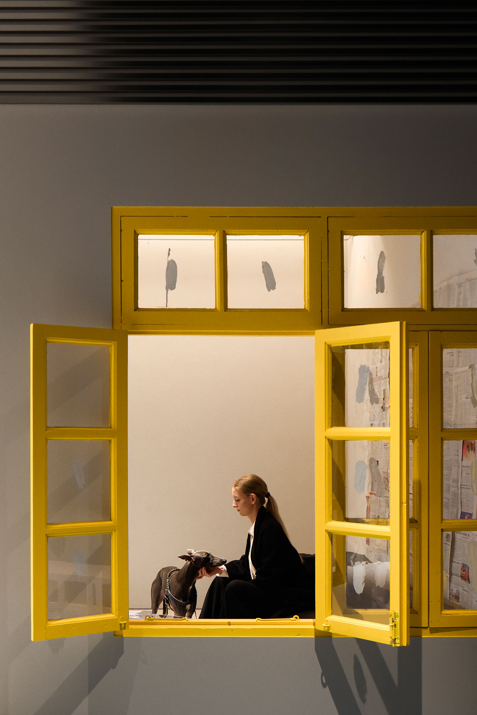 Frente a las instalaciones hay una ventana antigua con marco amarillo pintada de colores brillantes, tomada de un edificio abandonado, que ofrece una vista al salón/área de reuniones. Los trabajadores de la obra marcaron inicialmente los paneles de vidrio individuales con pintura blanca para evitar romperlos accidentalmente, lo que al diseñador le gustó y finalmente conservó por su efecto estético, creando otro objeto parecido a Malevich dentro del espacio.