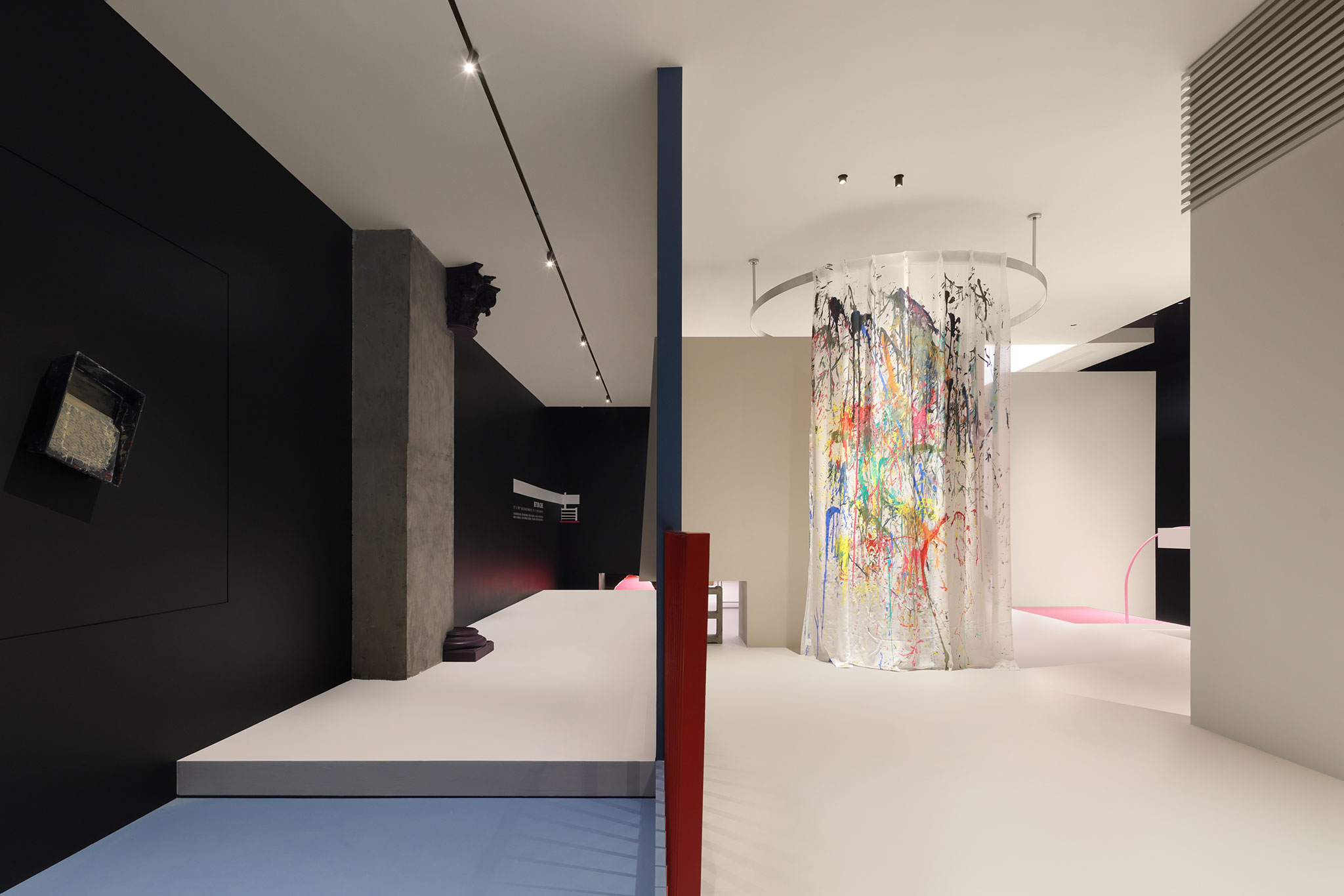Al aventurarse más en el área de exhibición principal, los visitantes encuentran una alta cortina blanca, colgada de un riel circular y salpicada de colores vivos; aquí, el diseñador buscó crear una forma novedosa de exhibir los productos de la compañía, rompiendo las expectativas de lo que es un "típico ' showroom es e introduce una sensación de espíritu libre y creatividad. Cada objeto pintado en el proyecto refuerza la calidad y los múltiples usos del productos de la empresa, que son capaces de adherirse a una amplia gama de superficies normalmente inadecuado para pintar.