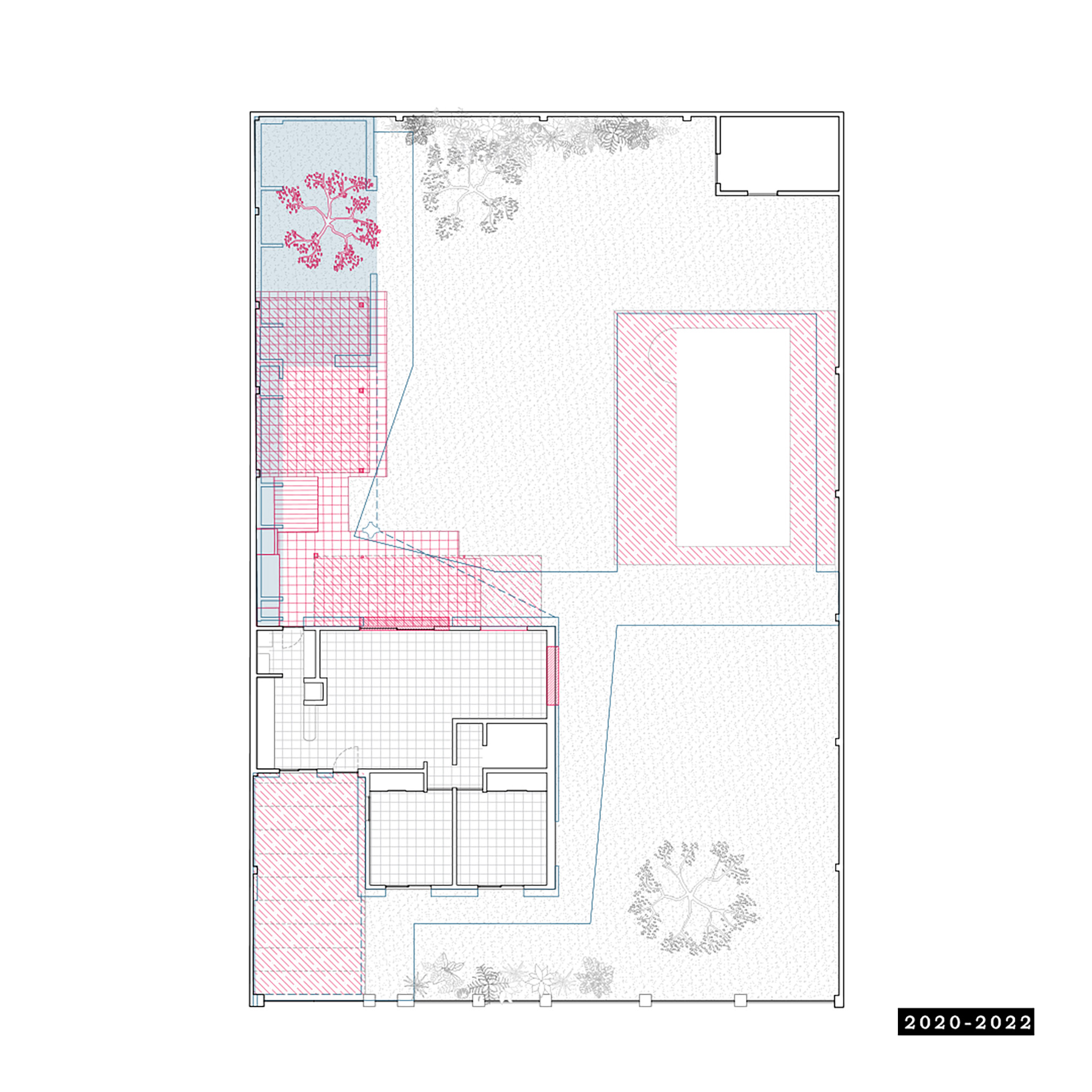 La propuesta se configura a partir de tres operaciones programáticas. En primer lugar, la vivienda original se abre al patio, ampliando una abertura existente e incorporando una nueva. En segundo lugar, se conforma una cubierta que acomoda una galería y una ampliación destinada a múltiples usos. En tercer lugar, se recubre la totalidad de la obra con una piel de ladrillo dispuesto en panderete. Complementario a este abordaje programático, dos operaciones materiales articulan la intervención: la que concierne a los muros y la que define la columna de la galería.