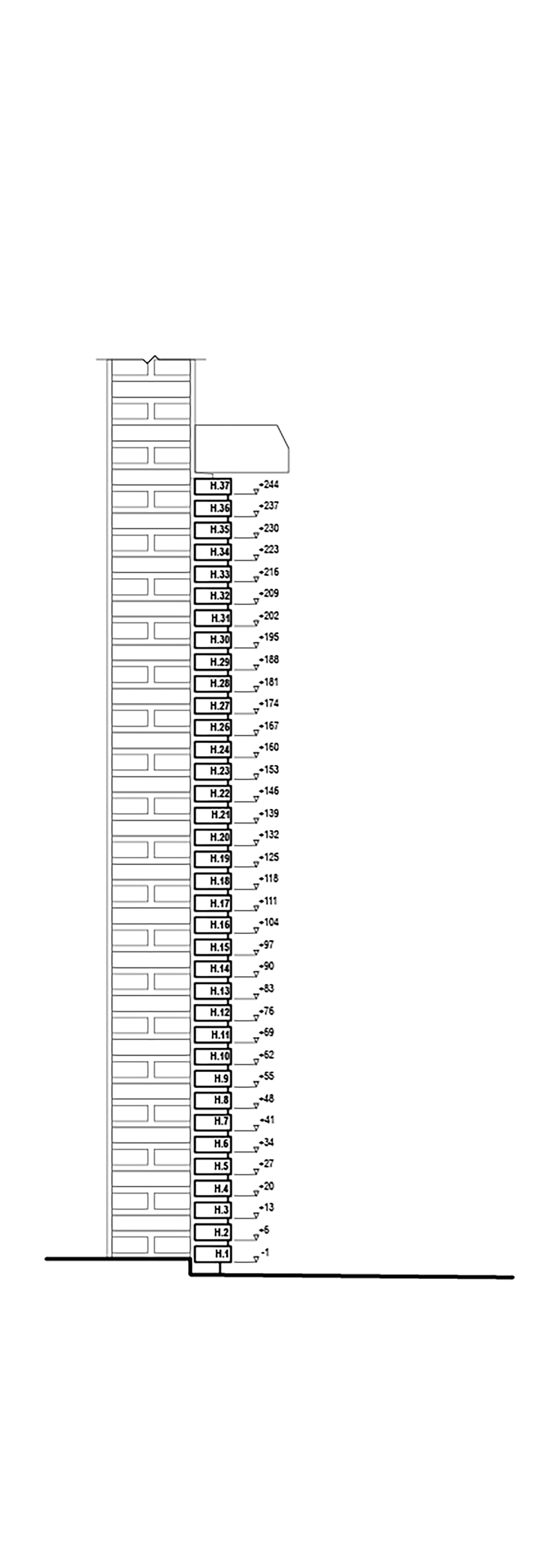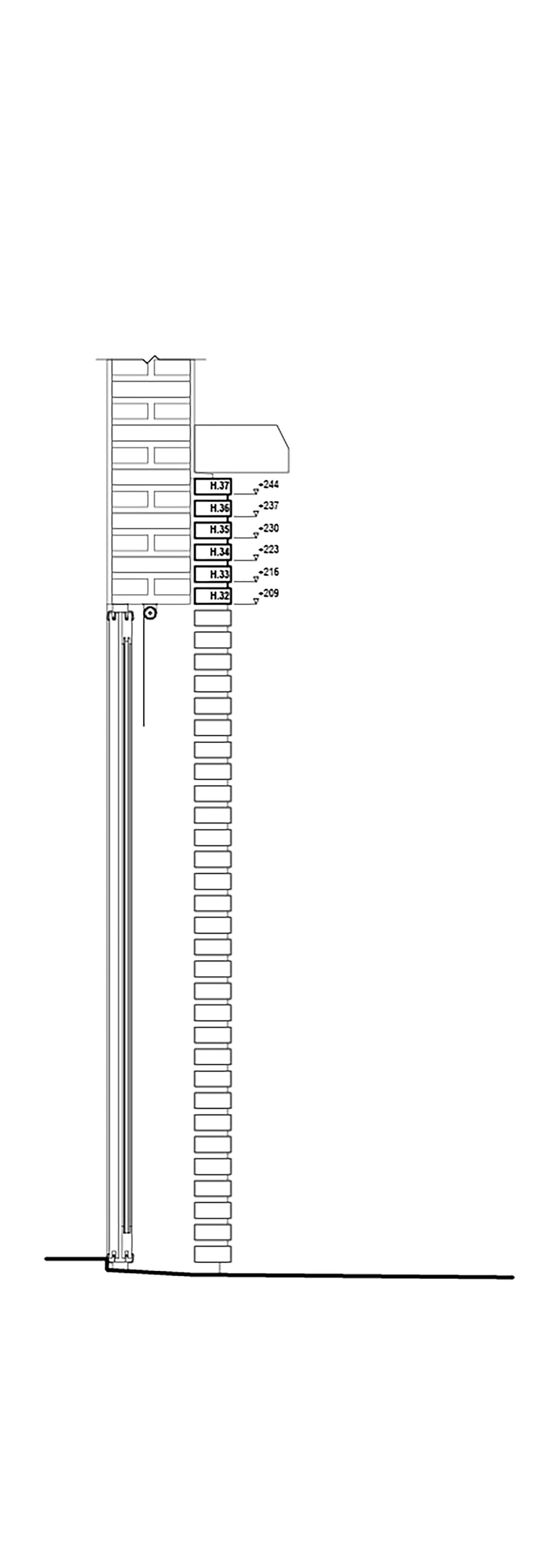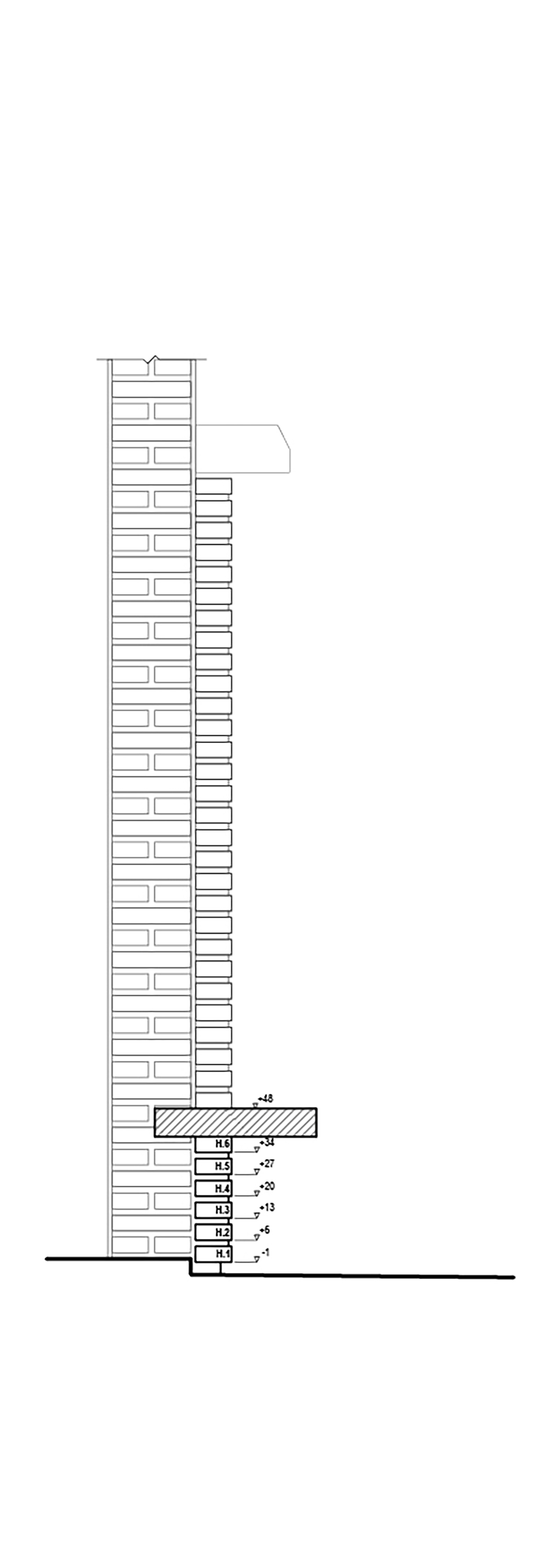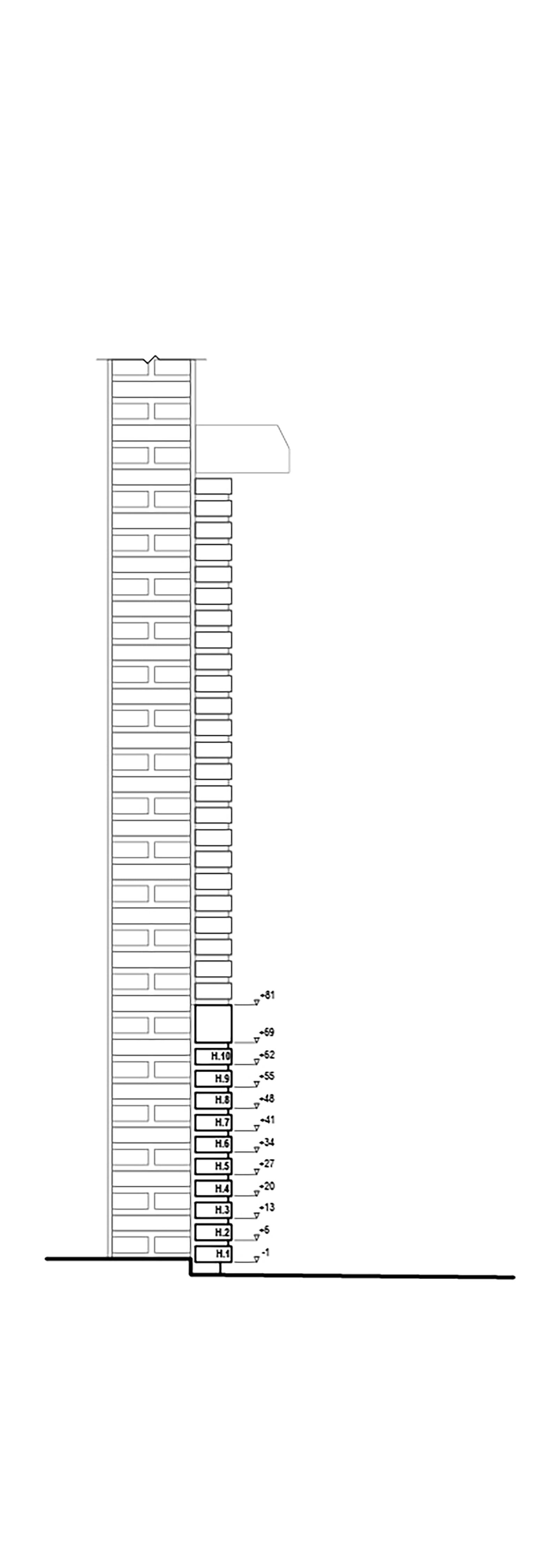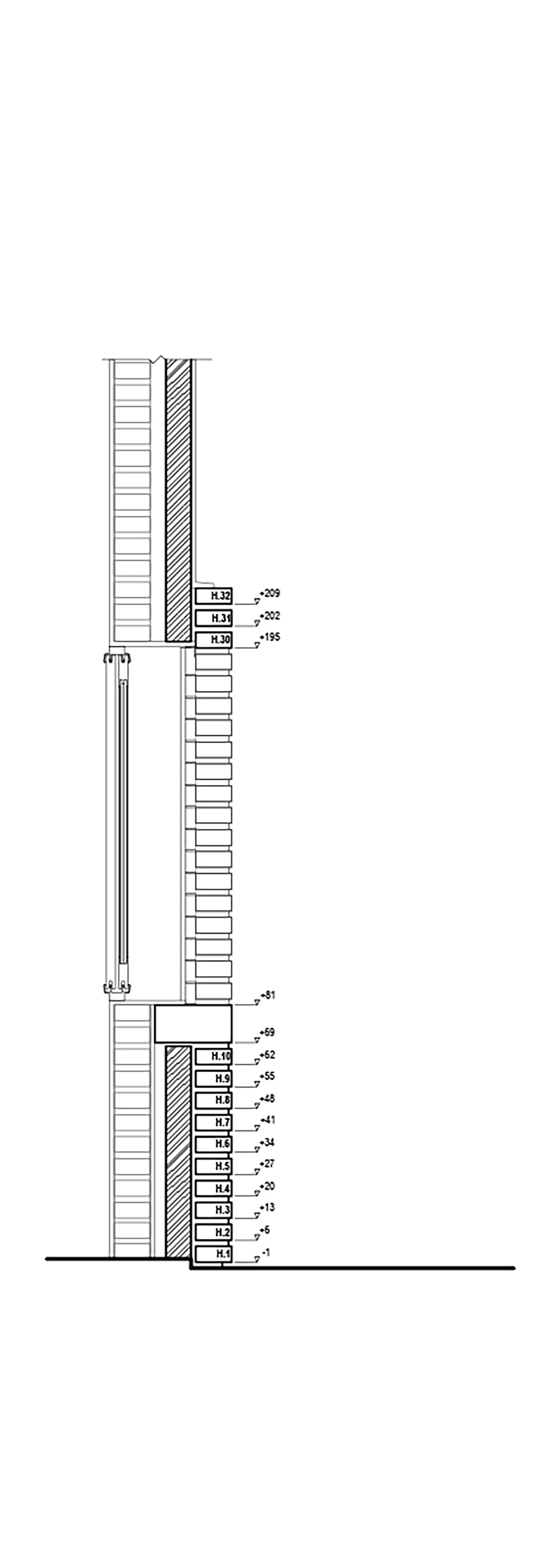 La piel de ladrillo recorre toda la fachada variando principalmente en altura. Las terminaciones principales, el ladrillo visto dispuesto a soga y el revoque fino pintado de blanco, se reparten sobre la envolvente exterior de acuerdo a criterios técnicos y funcionales. El gesto inicial es duplicar la masa muraría para mejorar la aislación térmica. Luego, una serie de elementos alteran su homogeneidad: un banco, una abertura, una cubierta, un dintel; cada elemento interviene sobre la piel, y esta responde a sus requerimientos. La disposición final responde a lógicas que no resultan aparentes a primera vista, permitiendo que la configuración resultante trascienda lo funcional.