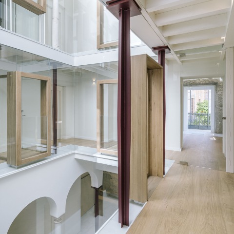 La estructura de muros y pilares de piedra del patio se hace visible mediante su vaciado y aligeramiento. Los muros pierden tanto su espesor como sus límites claramente definidos. Se sustituyen por estructuras metálicas que reinterpretan y dan continuidad a los pilares de piedra existentes. Por el contrario, los huecos y balcones existentes adquieren espesor y remiten a su posición y forma original.