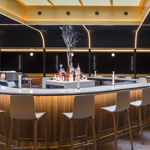 Desde que se entra en el edificio hasta que uno se sienta a la mesa, Stella's es una experiencia hostelera totalmente nueva, envuelta en elegancia y misterio: al abrir la puerta de aluminio, el espacio se comprime con un techo blanco curvado. La pared de ladrillo existente en un lado y su reflejo en la pared de espejo opuesta acompañan a los clientes al interior. En el vestíbulo, una pared de roble con una ventanilla de facturación espera a los visitantes, donde un portero invisible ficha a los huéspedes. Desde allí, una puerta de madera oculta revela un pasillo oscuro, donde el anfitrión recibe a los visitantes y los pasea por un espacio comprimido y en penumbra con paredes de madera. La escasa luz adapta el ojo y la pared curva ranurada obliga a cambiar de dirección y empuja al huésped al comedor cuadrado con una enorme claraboya de 16'x16' centrada en un fondo azul marino. La luz se filtra a través de una caja de huevos de aluminio dorado. Debajo, una barra girada 45 grados con esquinas curvas, da la bienvenida e invita a los invitados a las mesas perimetrales. Esta vista de la entrada acentúa la cuadrícula y permite al comensal echar un vistazo a todo el comedor, mientras que la pared trasera de espejos duplica todo el espacio, y una gran pantalla sirve de ventana digital.