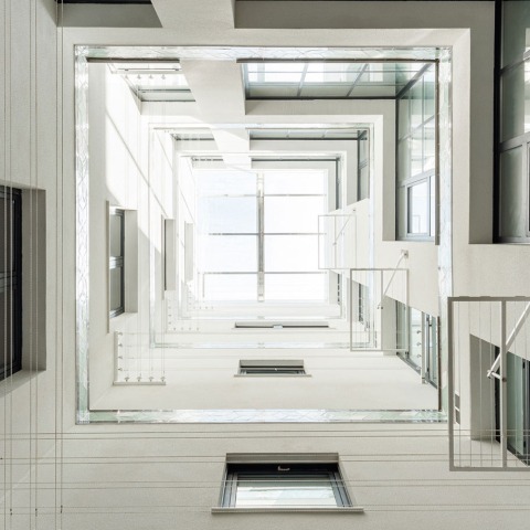 La colorimetría original de los espacios comunes (en este caso el color verde) se recupera como hilo conductor a través de las diferentes plantas y a través de las escaleras, rellanos de planta y patio de luces.