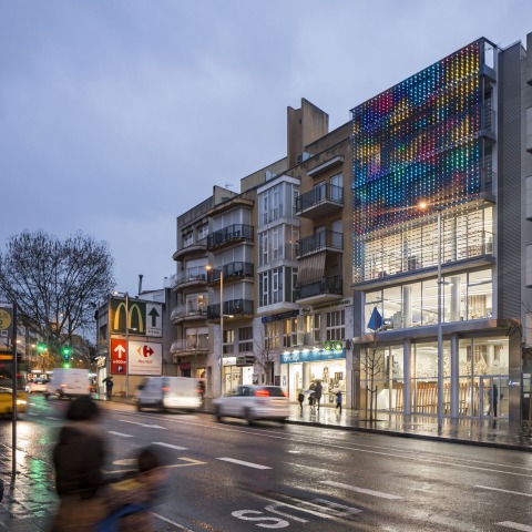La fachada se compone principalmente por un gran tejido metálico que sostiene numerosos puntos de luz de iluminación Led, con un ritmo y un tamaño diseñado en proyecto y personalizado con las aportaciones específicas del cliente. La posibilidad de integrar la iluminación como una capa principal que actúa como filtro posibilita trabajar en las aberturas y carpintería necesarias de las oficinas como una segunda capa no condicionada por los requerimientos urbanos del entorno, sino centrada en las necesidades propias de su uso. En el edificio toma especial importancia el conjunto de capas que conforman los planos de la envolvente.