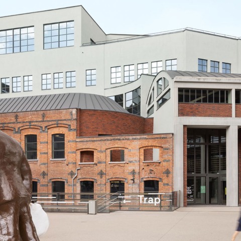 La fachada del enorme espacio del atrio -que es, en realidad, la más importante de todo el complejo- se adhiere estrechamente al original en su apertura y expresividad. También aquí se utilizaron finos marcos de acero negro para las ventanas, en combinación con la crudeza de los muros de ladrillo y las vigas de hormigón y la pátina del estuco parcialmente caído.