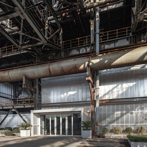 Específicamente, la firma se decidió por un enfoque ligero: una estructura de policarbonato totalmente independiente colocado dentro del perímetro de la estructura original. La solución no solo resuelve varios de los problemas técnicos del proyecto (impermeabilización, por ejemplo), el material translúcido complementa el volumen y el peso de las tuberías conservadas y las máquinas oxidadas alojadas dentro de la carcasa interior.