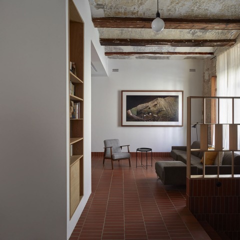 - Utilización de los mínimos materiales posibles. Toda la intervención gravita sobre tres elementos: los restos de tapial, los enlucidos de yeso pintados de blanco y el gres que resuelve los pavimentos interiores y exteriores, zócalos, peldaños y las paredes húmedas en baños.