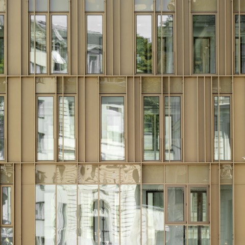 Las fachadas del nuevo edificio y ampliaciones están compuestas por una malla vertical de color bronce que se extiende a lo largo de la fachada a la calle, al patio principal y al jardín. El ritmo de la fachada y su malla fueron diseñados para tejer el vínculo entre los diferentes espacios y temporalidades.