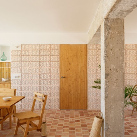 El barro como material humilde y habitual. Un abanico de piezas diferentes da respuesta precisa a las diferentes necesidades constructivas. La termoarcila, colocada de canto, muestra su condición no portante, ni acústica. La termoarcila modula, caracteriza y viste de manera semperiana, el espacio principal. La baldosa reviste, a veces el pavimento, con una junta muy ancha, a veces las paredes, con una junta más estrecha. La baldosa a veces vidriada también protege las zonas húmedas. Puntualmente, la baldosa acompaña los regueros de óxido de las barandillas. El residuo de los “colombrins” triturados nos sirve como grava de barro. Y un largo etcétera. Tanto por la acumulación de piezas pequeñas y diferentes, como por los ligeros cambios de tono del propio barro, creemos que la materialización reduce la escala y consigue definir un espacio más domestico y humano.
